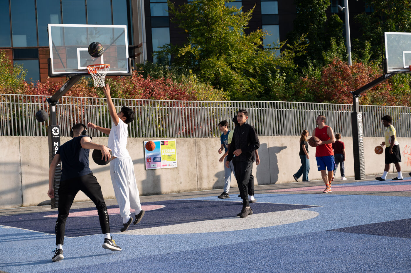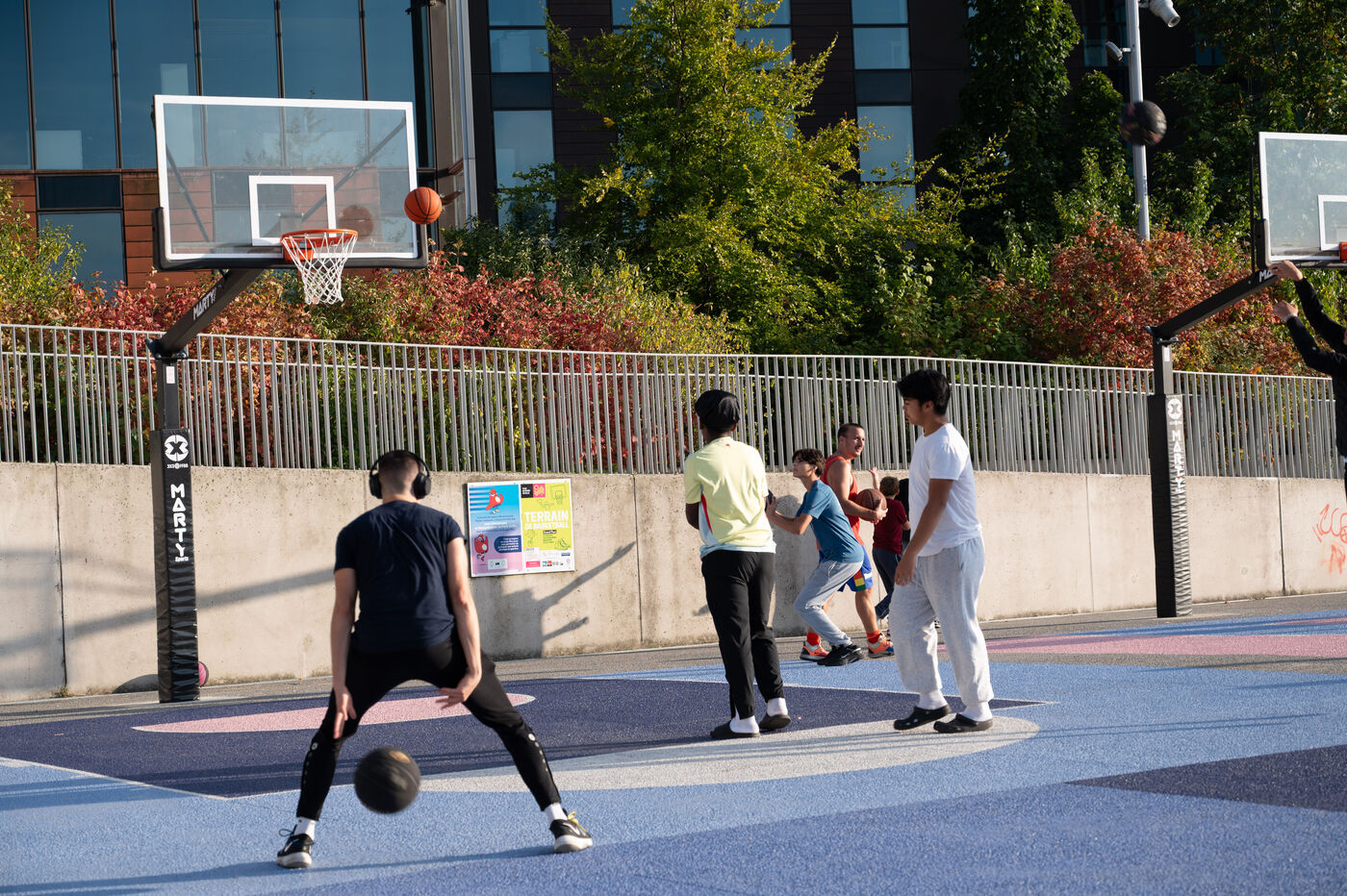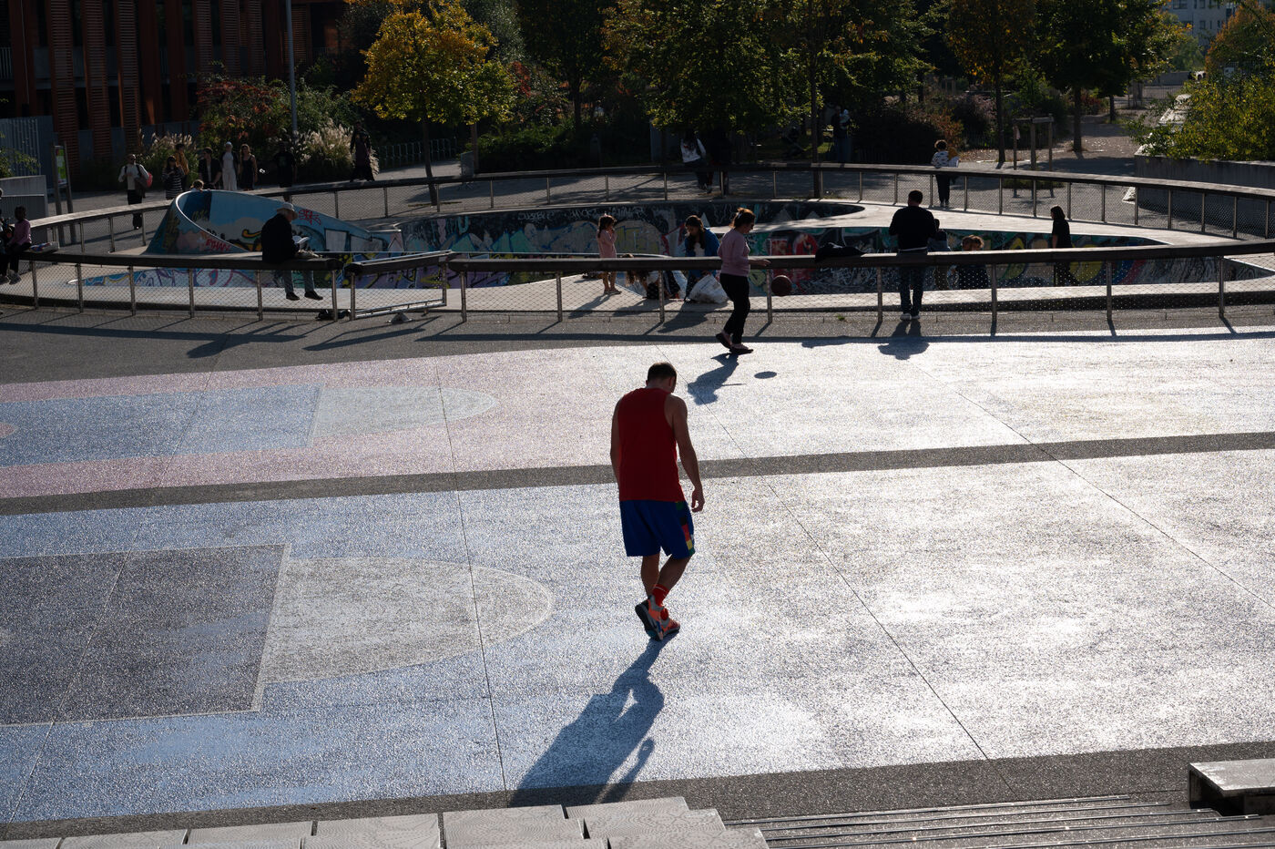 This series of photographs highlights the dynamic of the Parc des Docks in Saint-Ouen, where basketball and skateboarding intersect. Through these images, we discover young and adult athletes in action, sharing their passion for sports. One photo captures a grandmother sitting on the railing of the skatepark, symbolizing the intergenerational mix within this vibrant space. These images illustrate the community spirit and the importance of outdoor sports in an urban environment.