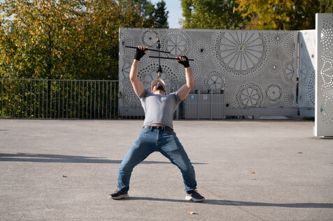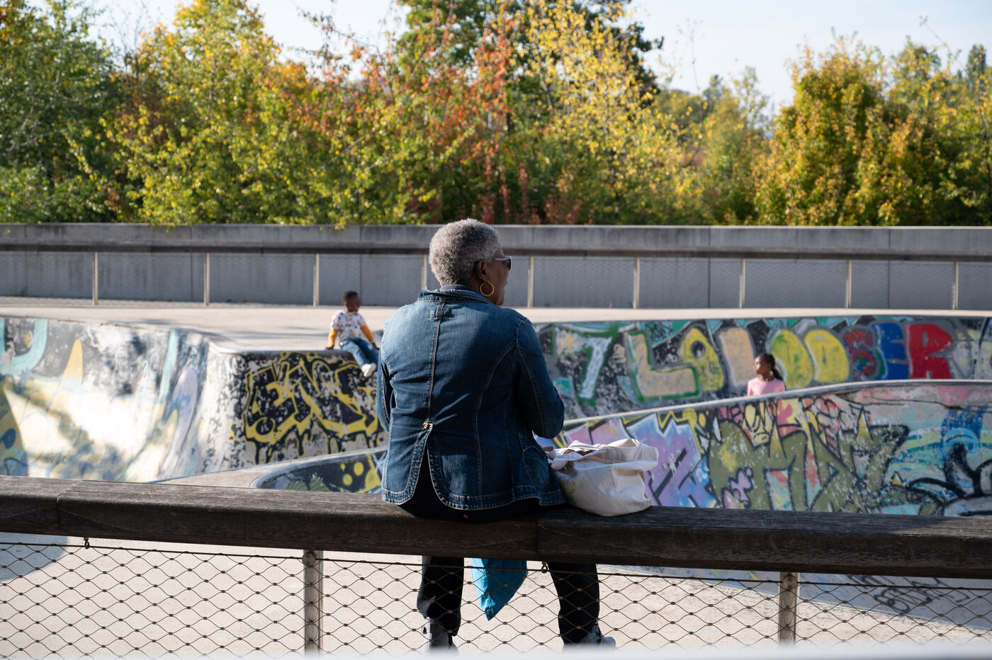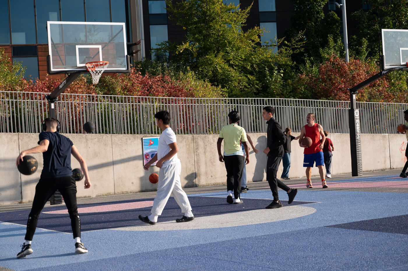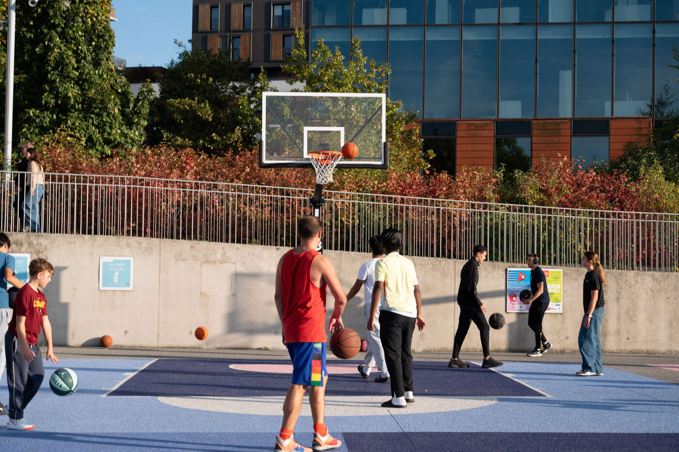 This series of photographs highlights the dynamic of the Parc des Docks in Saint-Ouen, where basketball and skateboarding intersect. Through these images, we discover young and adult athletes in action, sharing their passion for sports. One photo captures a grandmother sitting on the railing of the skatepark, symbolizing the intergenerational mix within this vibrant space. These images illustrate the community spirit and the importance of outdoor sports in an urban environment.