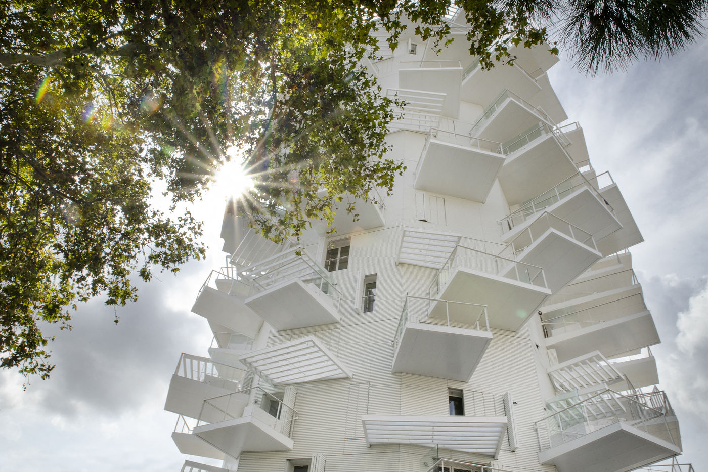 L'Arbre Blanc de l'architecte Sou Fujimoto est l'immeuble le plus haut de Montpellier (34) avec ses 56 mètres de haut et ses 193 balcons suspendus dans le vide. Septembre 2018.