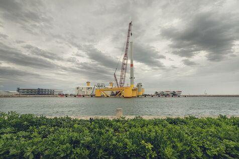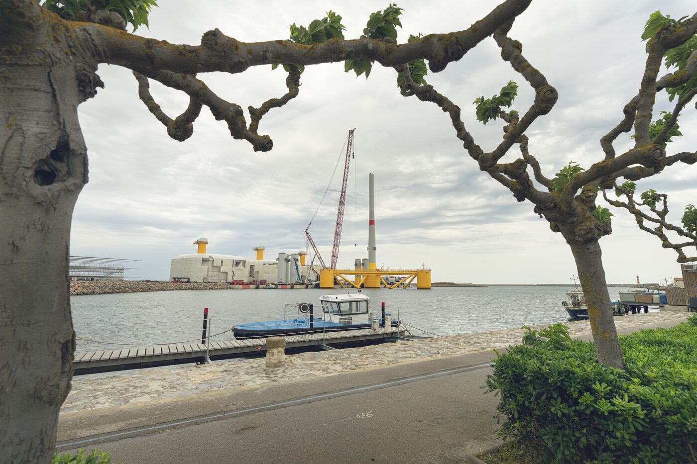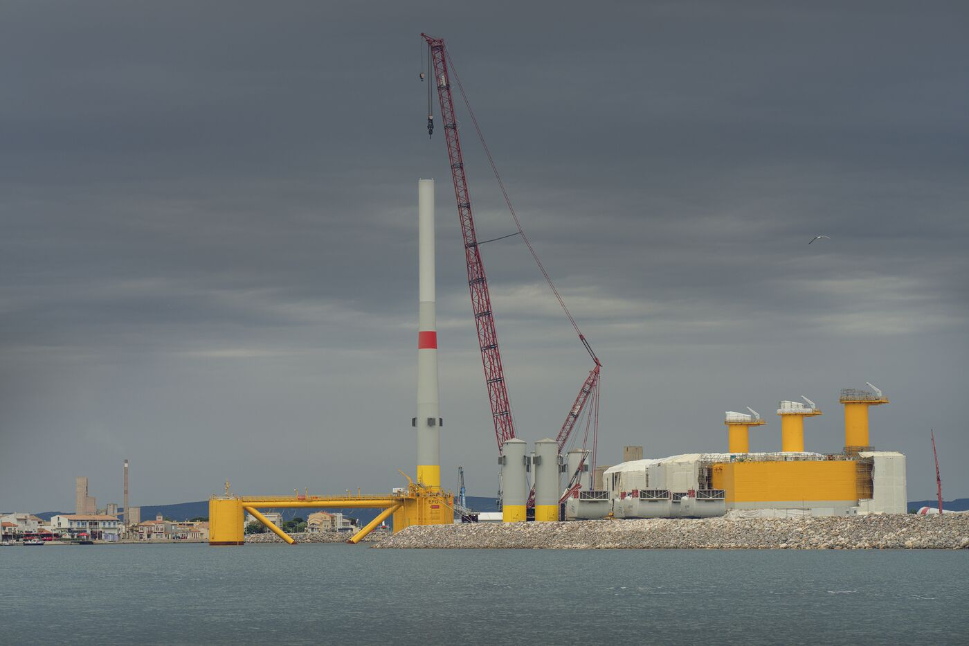 Chantier d'une éolienne en cours de montage du parc pilote EFGL (Eoliennes Flottantes du Golfe du Lion) en construction à Port-la-Nouvelle dans le sud-ouest de la France le 2 juin 2025.