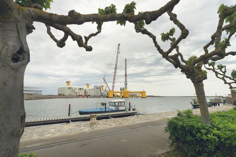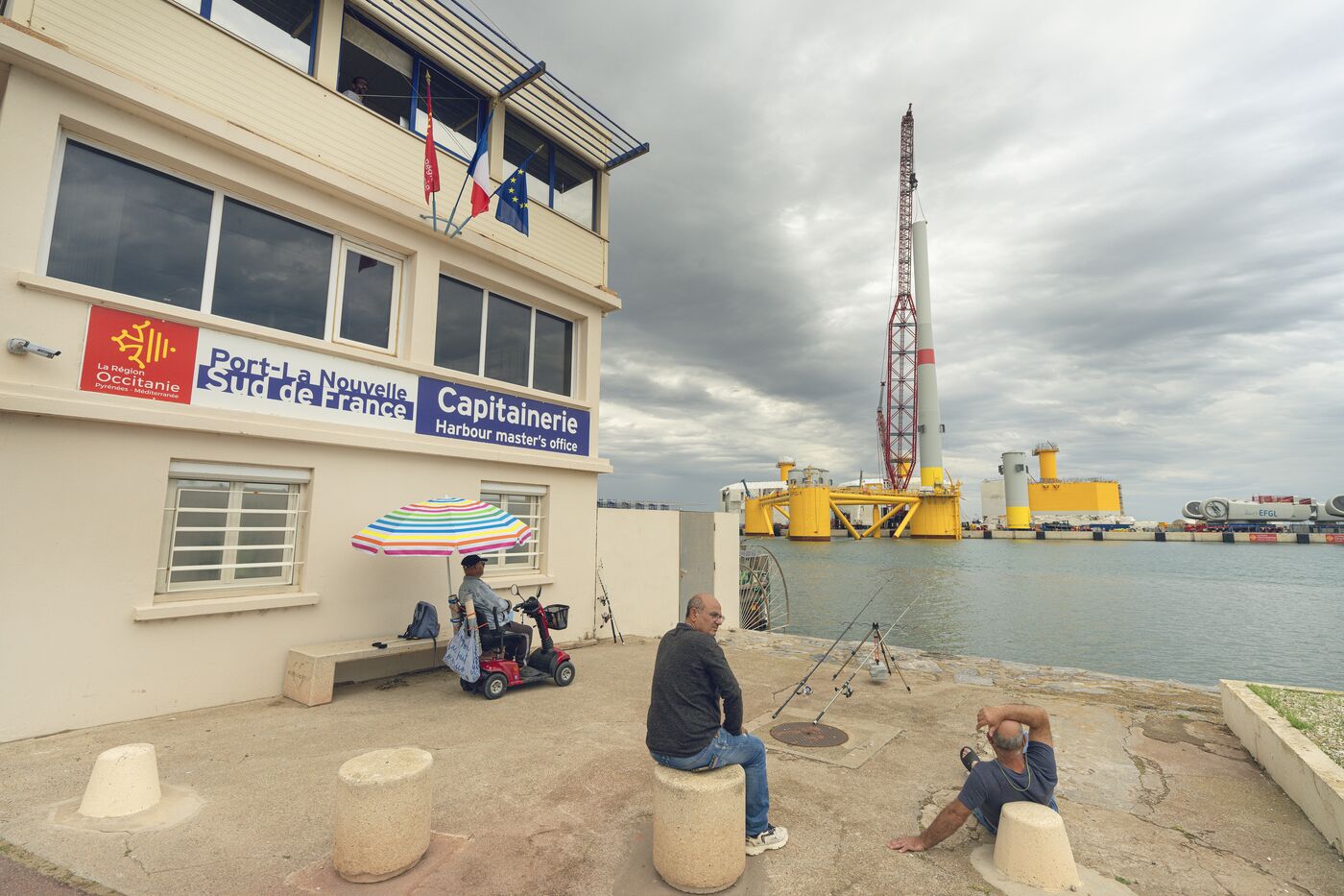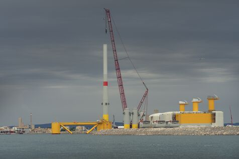 Construction site of a wind turbine being assembled at the EFGL (Eoliennes Flottantes du Golfe du Lion) pilot park under construction in Port-la-Nouvelle in the southwest of France on June 2, 2025.