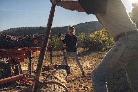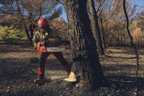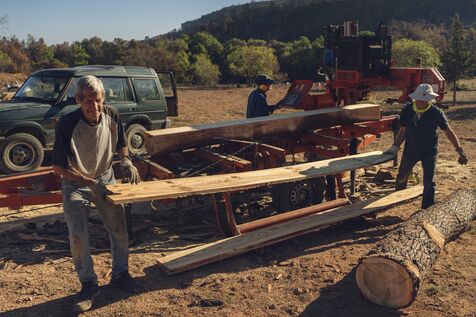 To ensure that Corbières wood remains in Corbières: sawing site at Manu Bernier with the Beauregard peasant third place using the trees burned in the Corbières fire and transforming them on site to create the raw material for reconstruction.
