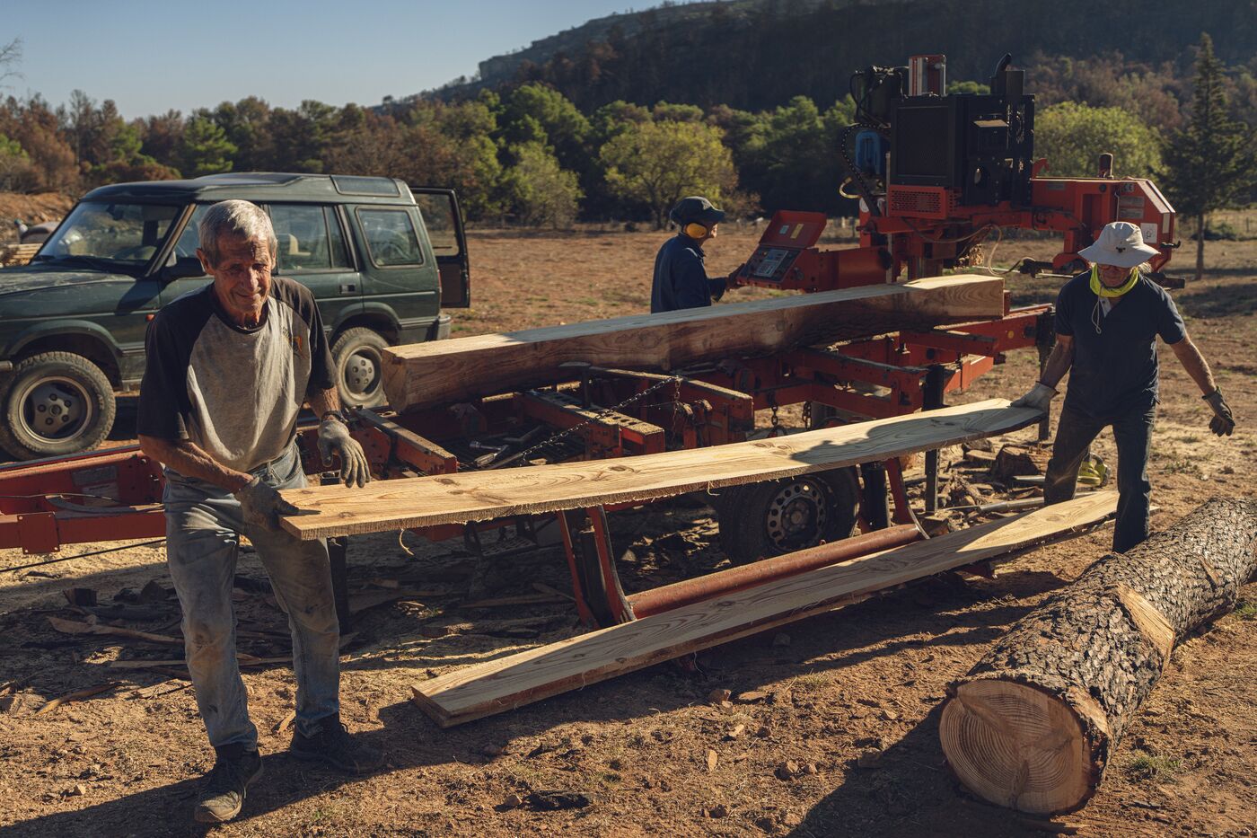 Pour que le bois des Corbières reste dans les Corbières : chantier sciage chez Manu Bernier avec le tiers-lieu paysan Beauregard en utilisant les arbres brûlés dans l’incendie des Corbières et en les transformant sur place pour créer la matière première pour la reconstruction.