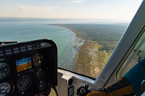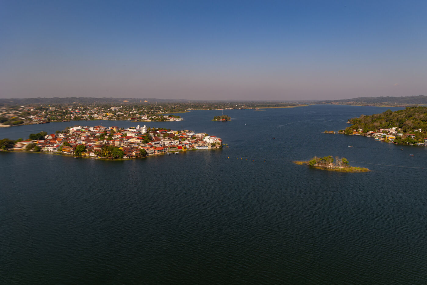 Mirador, Guatemala, March 2025. It takes a 30-minute helicopter ride from Flores to reach El Mirador, meaning “Viewpoint” in Spanish— nestled in the far north of the Guatemalan jungle. The flight itself already tells a story: you see rising waters creeping around the city of Flores, flooding some houses on the shore, then further on, the scars left by cattle ranchers and farmers, felled trees, large water-filled pits dug along the forest’s edge. The government lacks the financial means to protect the entire Maya Biosphere Reserve. The jungle is retreating.