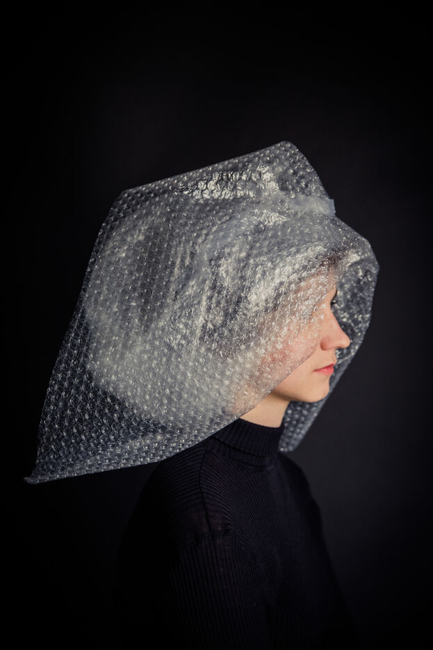 Autour de lui, les bonnets se transforment au fil de ce que l’on trouve sous la main : symboles fragiles, historiques ou contemporains. Des coiffes de lumière dans l’obscur, résistances à l’obscurantisme.