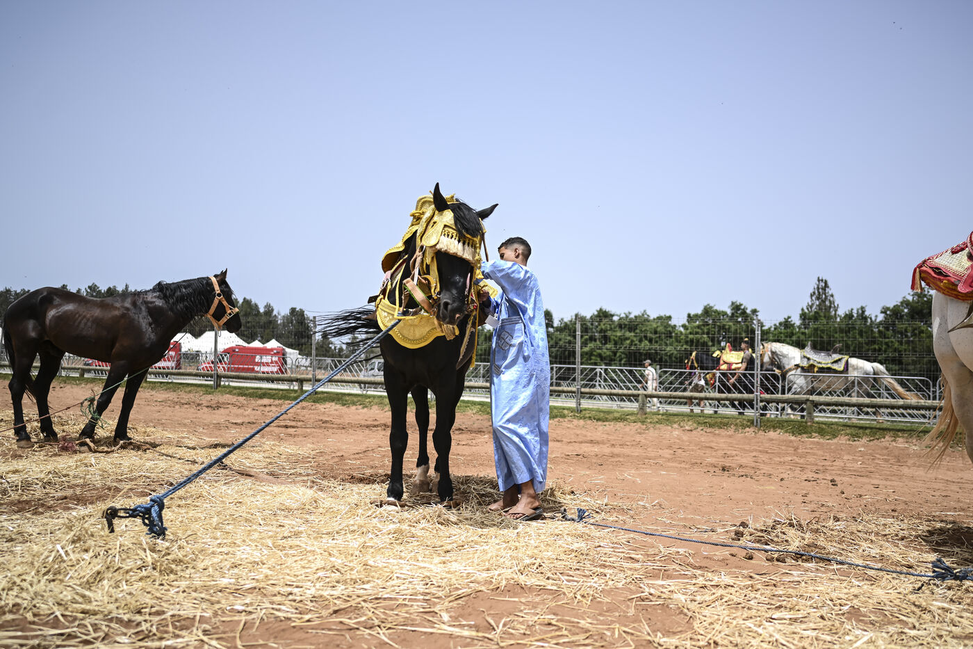 Inside a traditional Moroccan tent, the story unfolds. Tbourida uniforms are carefully laid out: draâ, trousers, belt, yellow slippers, and copies of the Quran. In this symbol-laden space, young riders help one another dress and prepare, performing a collective ritual that reinforces discipline and solidarity. At the heart of this preparation stands El Aaida Hassan, a young Moqaddem from the Guelmim-Oued Noun region, responsible for leading his Sorba with rhythm, visual harmony, and moral authority.