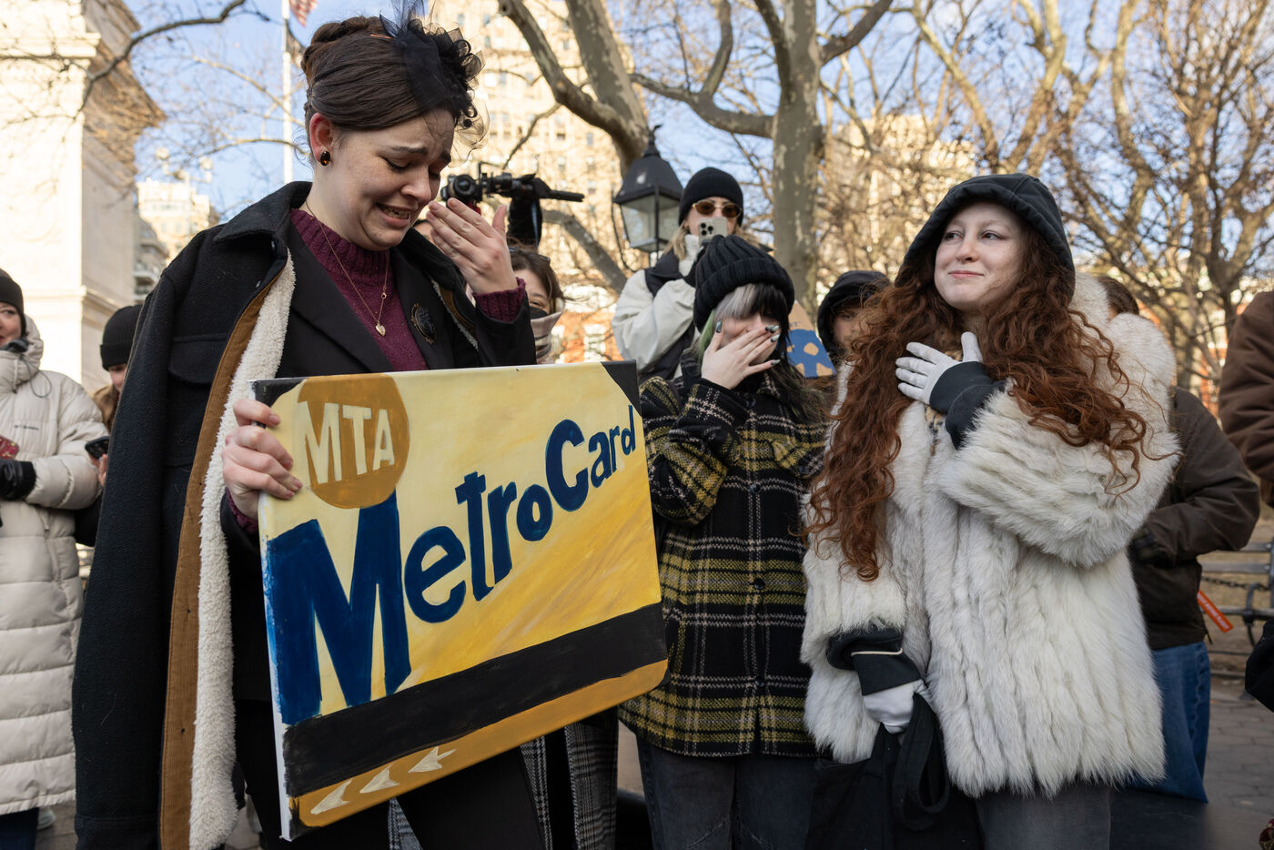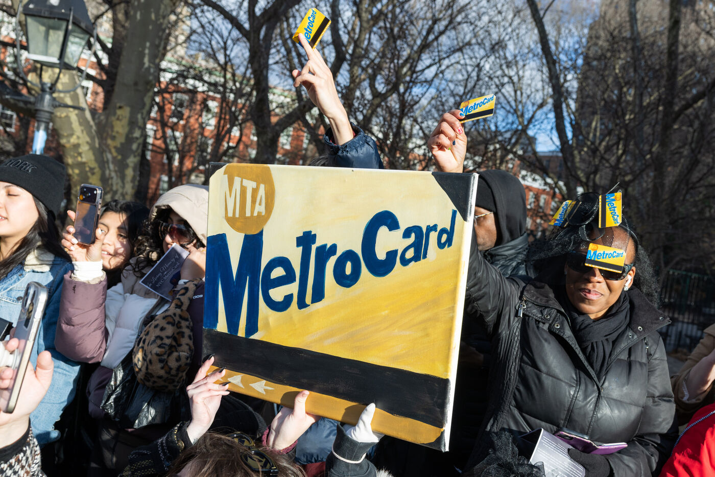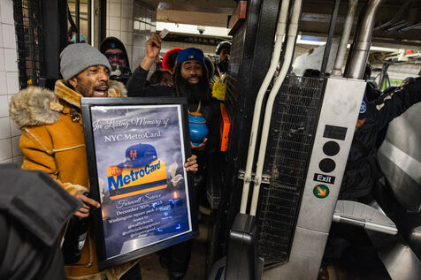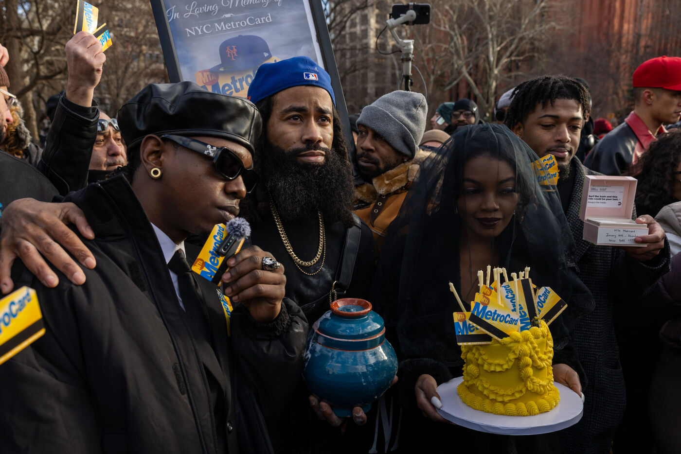 New Yorkers gathered in Washington Square Park for a memorial service organized by online creators Wafflekozik, Official KiingSpiider, and Dupre God to pay their respects and tribute to the MetroCard in New York City, NY, United States on December 30, 2025. The MetroCard, which had been the primary means of paying for public transportation in New York City, was announced to no longer be sold at the end of the 2025 and be replaced by the new OMNY card system.