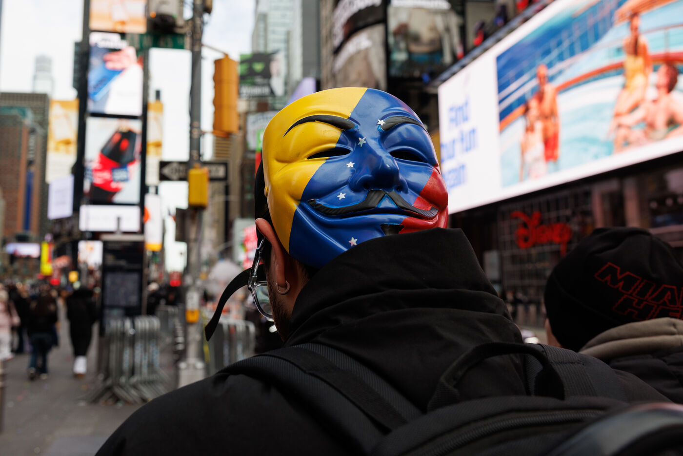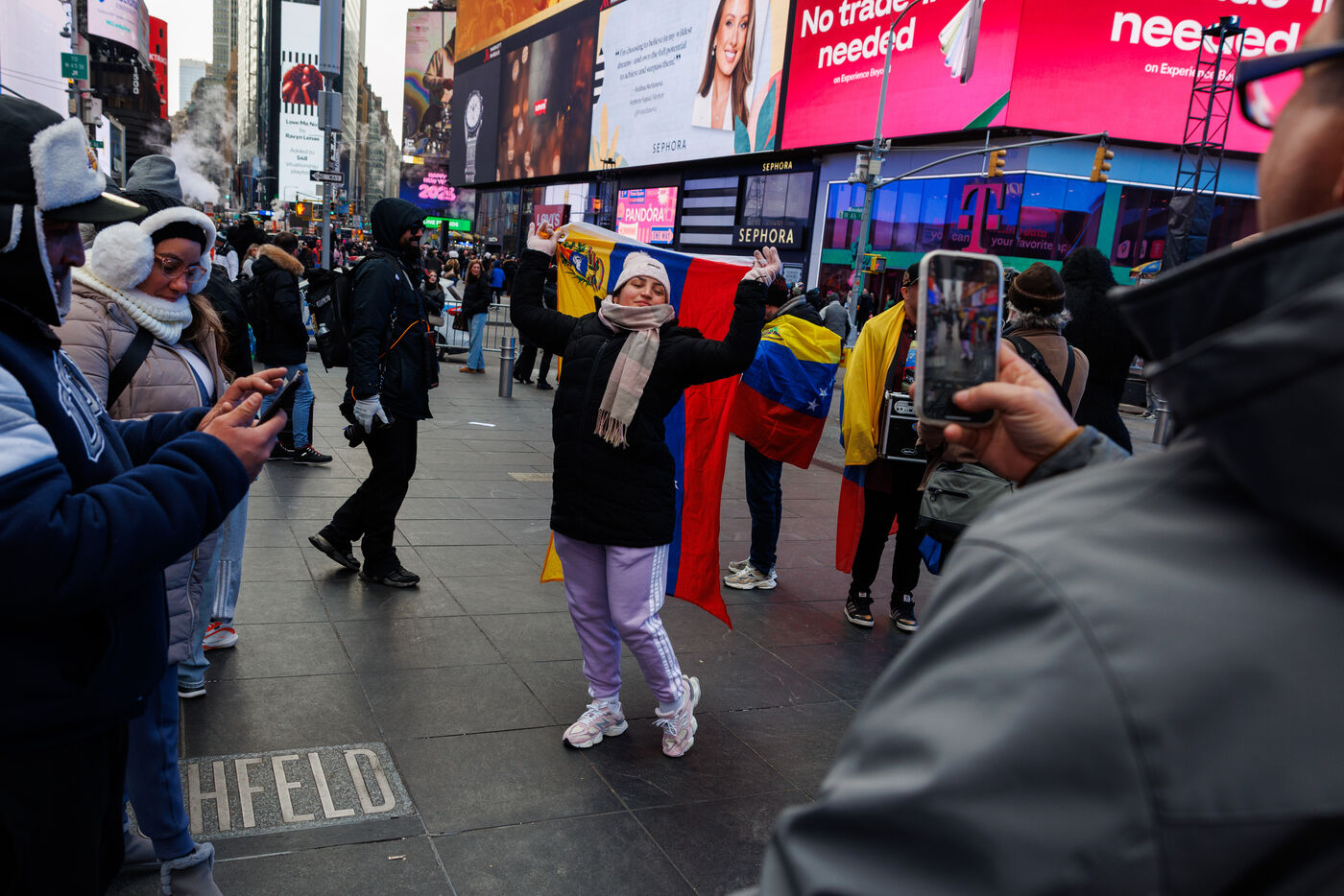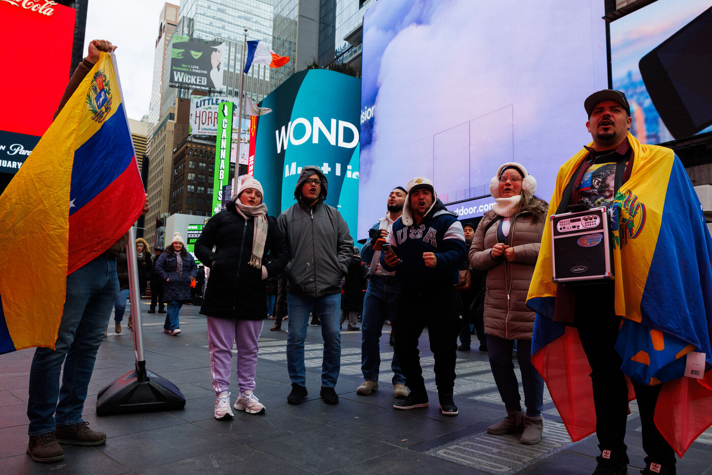 People gathering in Times Square in New York City, New York, United States following a coordinated military operation carried out by the United States government in Venezuela against President Nicolás Maduro on January 3, 2026.