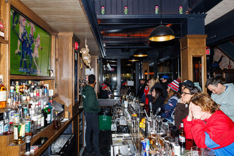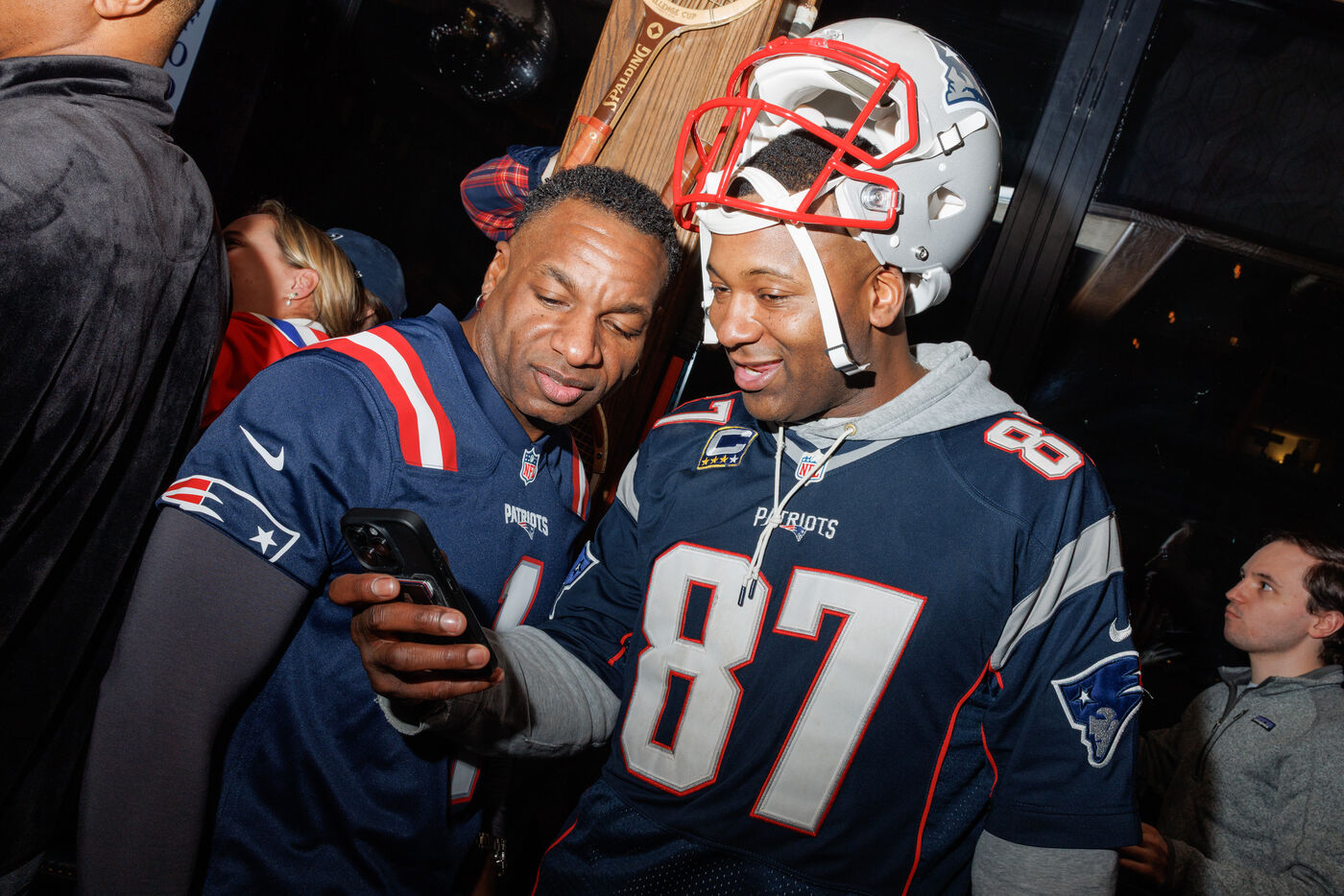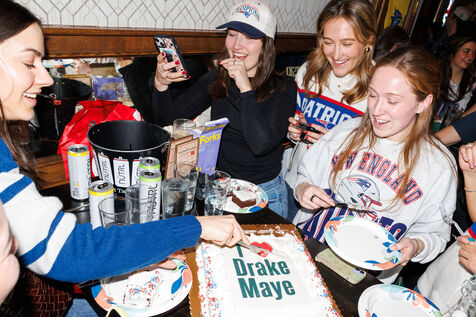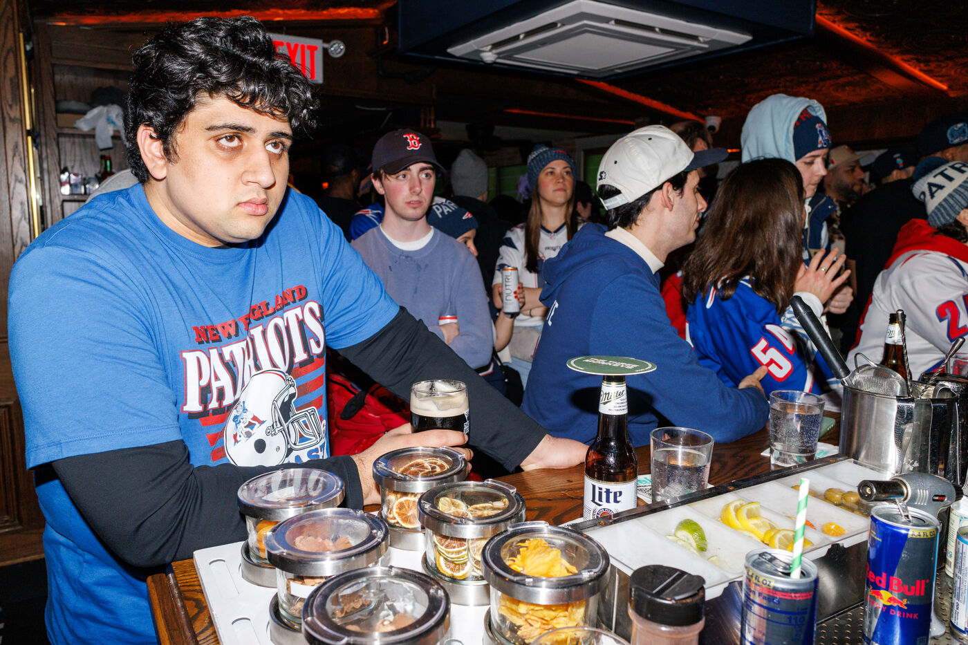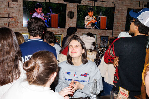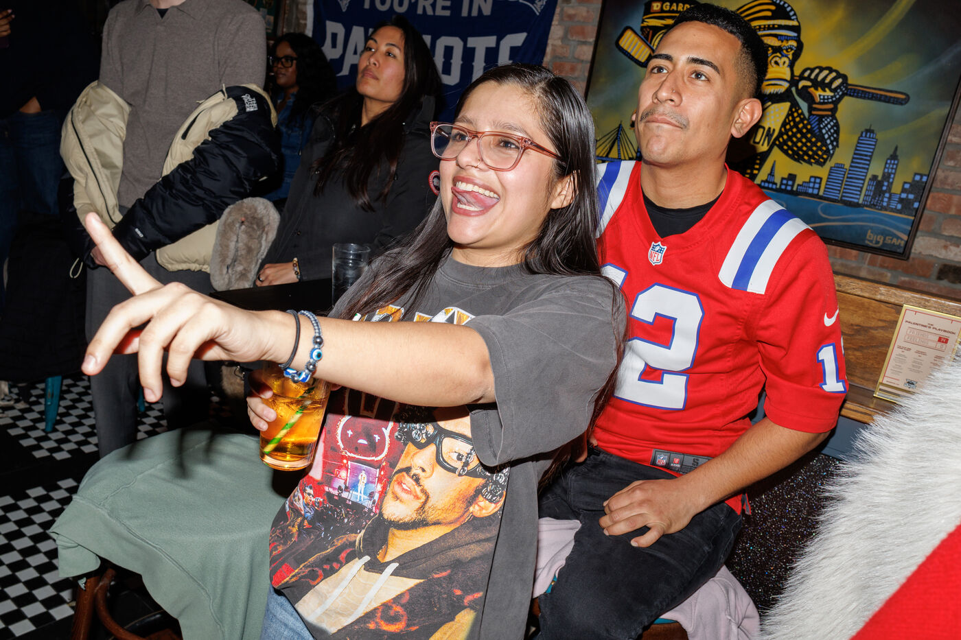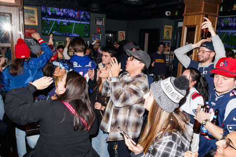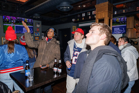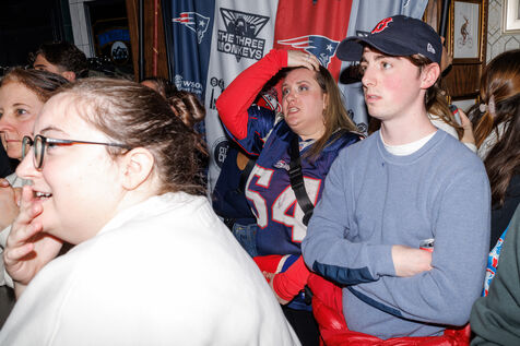 People attend a watch party for Super Bowl LX held at Three Monkeys bar in New York City, New York, USA on February 8, 2026. The New England Patriots are taking on the Seattle Seahawks at Levi's Stadium in Santa Clara, California.