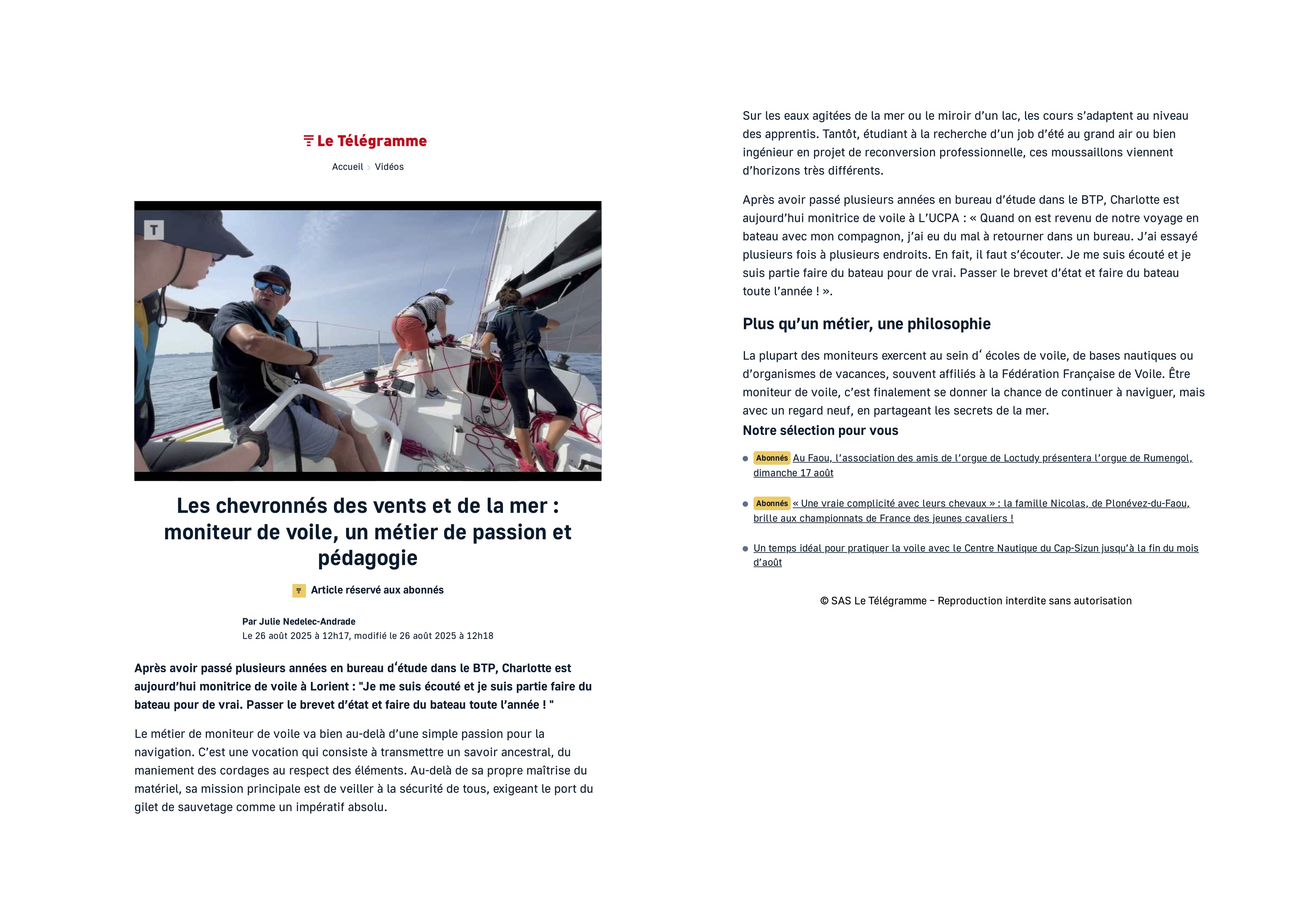 Julie Andrade Publications Séries / Archive Marseille — Société — Sport Sélection de séries Le capitaine Deschamps quitte le centre de secours d'Auray (56) - Le Télégramme, 19 septembre 2025 Web - Moniteur de voile, un métier de passion et pédagogie- Le Télégramme, 26 aout 2025 Sensations garanties au simulateur de chute libre - Le Télégramme, 20 août 2025 Ces entreprises qui sont punies, Challenges n. 732 - 3 mars 2022 COP26: Paris fait fi du fossile hors (son) sol - Libération, samedi 13 et dimanche 14 novembre 2021 Le Mag Tara Océan no. 3 - 2021 Rapport Annuel Fondation Tara Océan - 2021 Mikaa Mered : « Nous sommes déjà entrés dans un monde postpolaire » - Le Point n. 2466, 28 novembre 2019