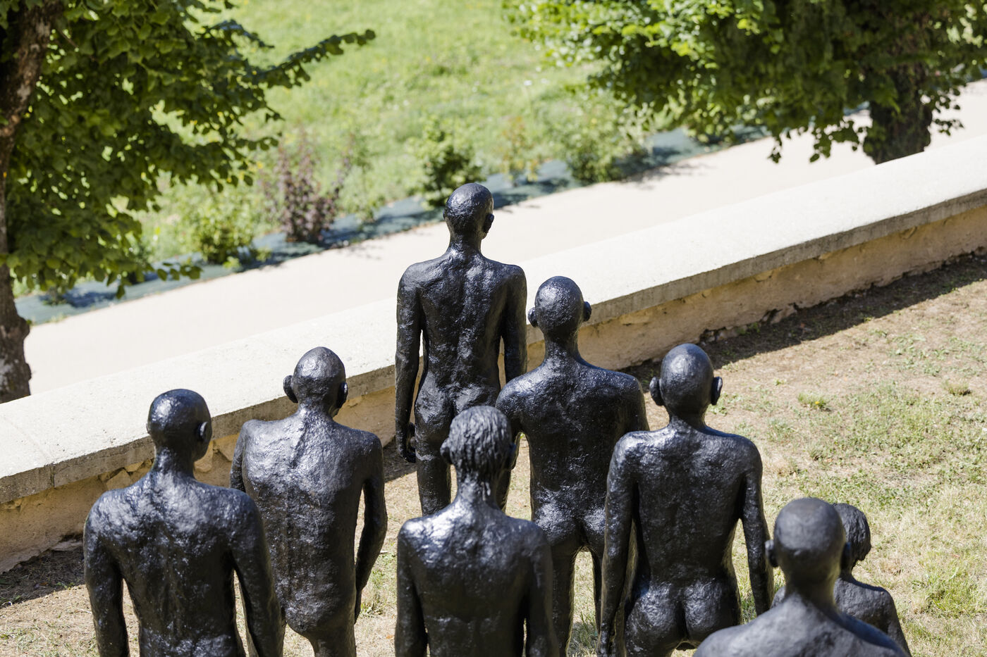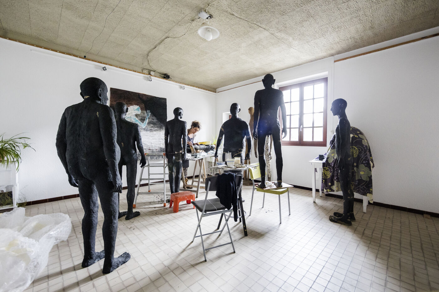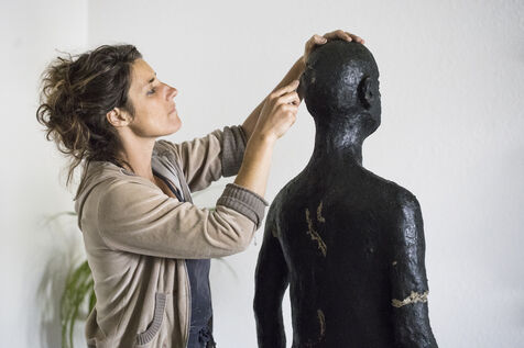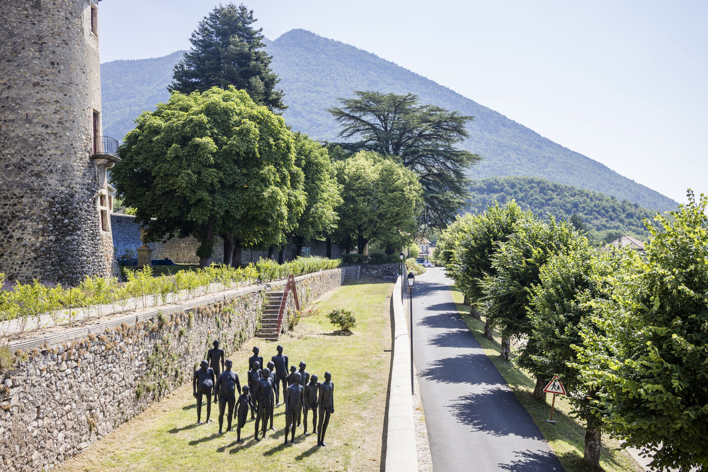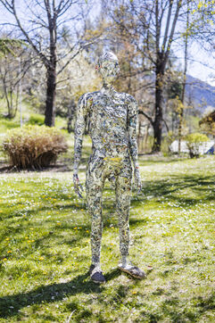 Report on the plastic artist Barbara Fougnon for her sculpture project "Forêt d'hommes": collective workshop at the Edith Seltzer foundation in Briançon, solo work session at her artist’s studio in Mont-Dauphin, installation at the Château de Montmaur