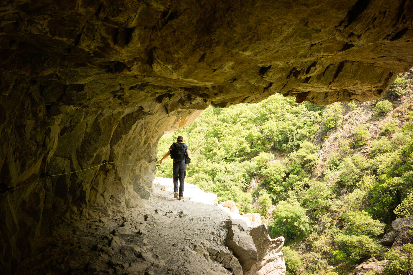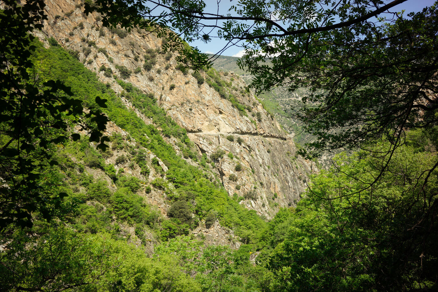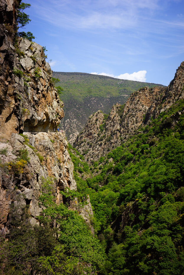Carved out in 1943 to provide access to the water catchment site for the Thuès hydroelectric plant, the historic corniche is a testament to human ingenuity in an extreme environment. Today, it provides access to a deep canyon carved out of the rock, where lush, almost tropical vegetation flourishes in contrast to the harshness of the rock.