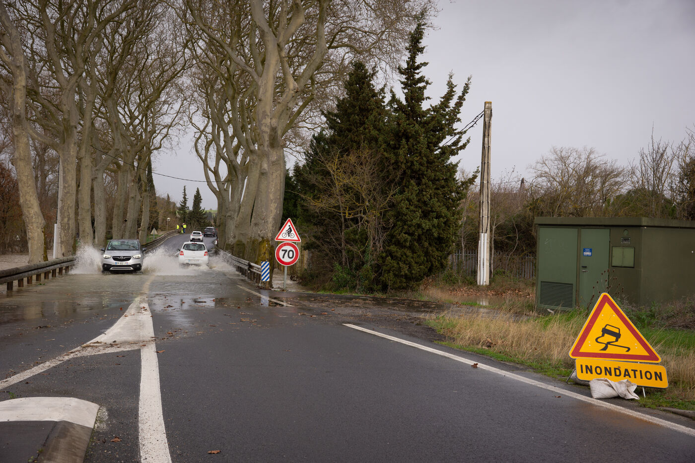 Passage of Storm Nils in Occitanie and southern France: the strong winds and heavy rainfall accompanying the weather event cause flooding and the closure of numerous roads in the commune of Bram, in the Aude department.