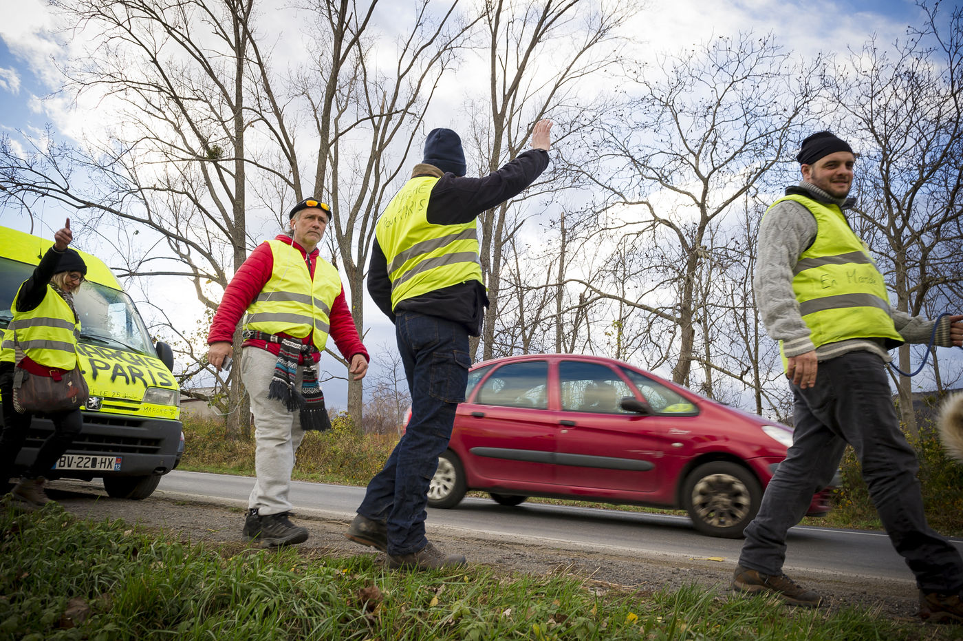 Gilets Jaunes pacifistes, Patrice, Sébastien, Eric dit Ricou et Gaël, partis tous les 4 de Mende à pied le 3 décembre comptent rejoindre Paris le jour de Noël.