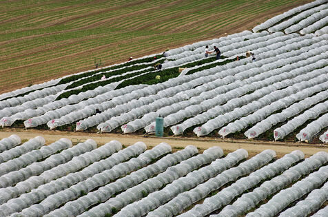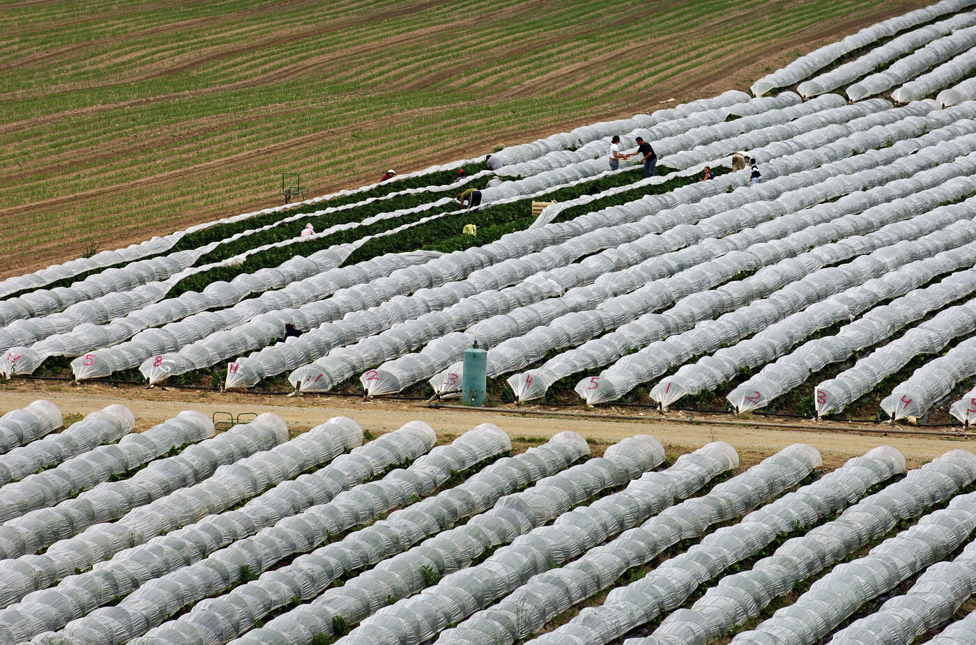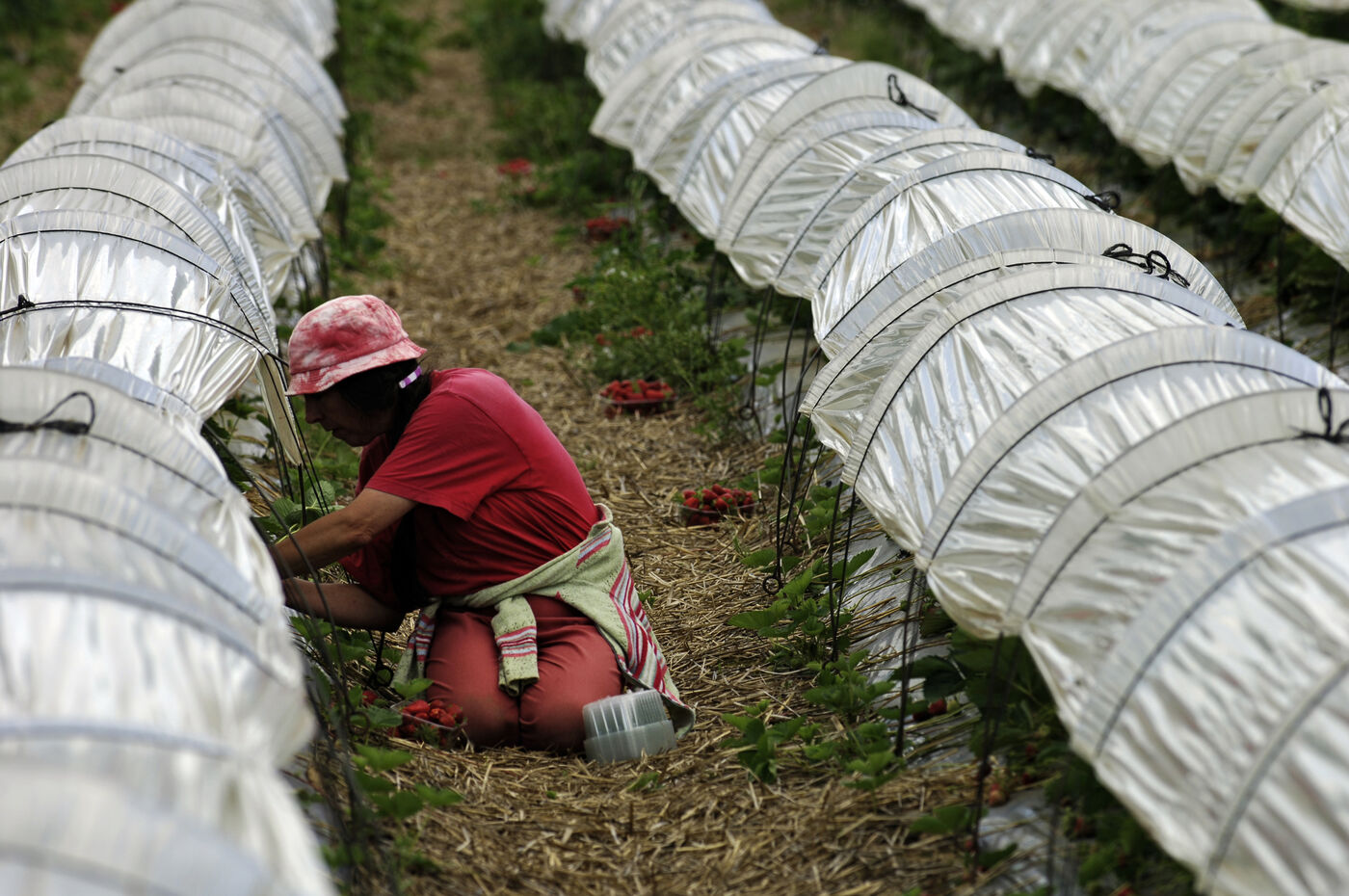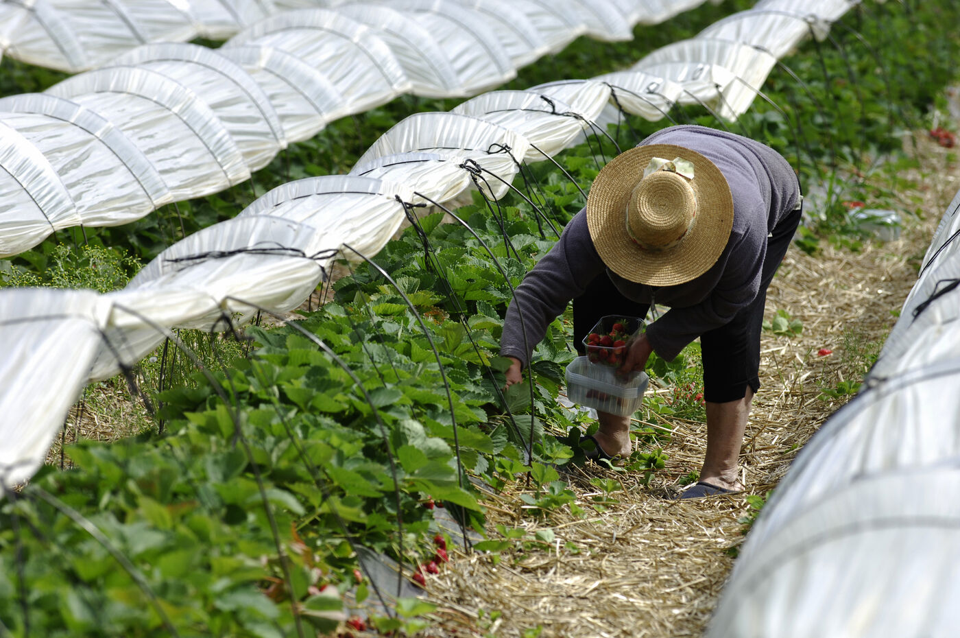 Harvesting strawberries grown in the ground