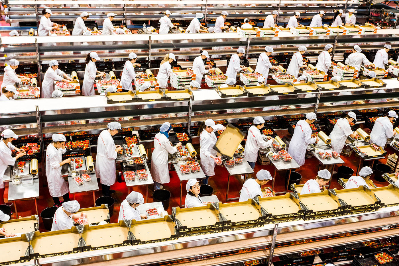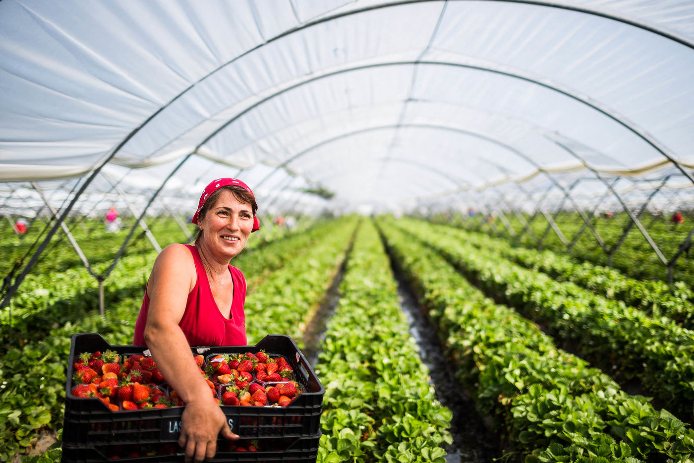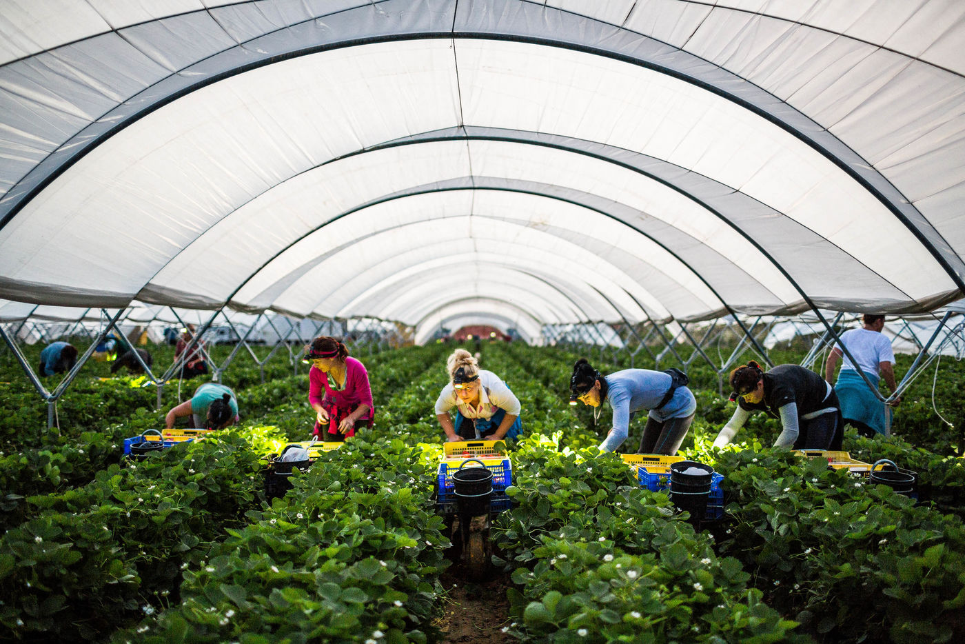 Chaque année, ce sont 300 000 tonnes de fraises qui y sont produites, principalement des plants de Camorosa, une variété créée en laboratoire, en Californie. Plantés en Novembre, les agriculteurs de Huelva récoltent sans interruption des fraises pendant 4 à 6 mois, de Janvier à Juin. Afin de récolter leurs fruits, les producteurs andalous font appel, chaque année, à près de 100 000 saisonniers, majoritairement des femmes, provenants pour la plupart d'Europe de l'Est, du Maghreb. De jour sous le chaud soleil andalous ou de nuit, ses ouvrières travaillent pour 37€/jour, 7j/7 pendant 4 à 6 mois. Bien que difficile, ce travail est néanmoins mieux payé que ce que le marché du travail propose dans leur pays d'origine et c'est pour cette raison que les saisonnières reviennent d'année en année, depuis plus de 10 ans pour certaines d'entre elles...