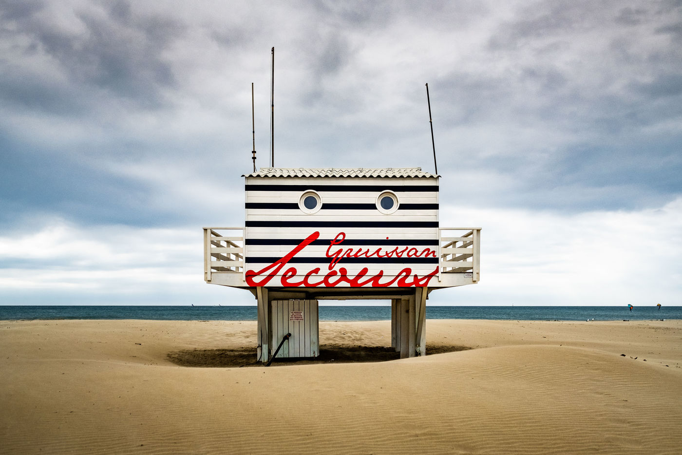 Mai 2022, Chalets de Gruissan. Plage de la commune de Gruissan, connue pour ses chalets et rendue célèbre par le film 37°2 le matin.