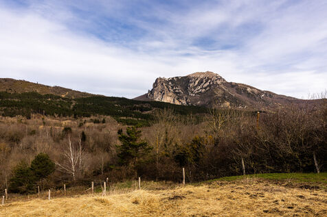 Saint Louis et Parahou, Aude, 27 février 2025, portrait de Monika, fromagère et éleveuse d'ovins et brebis de race Manech Tete Noire dans les Corbieres et de son sein du GAEC La Borde, face au Pic du Bugarach.