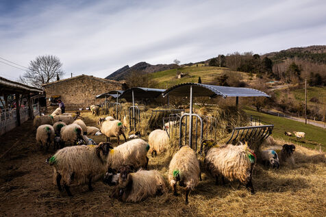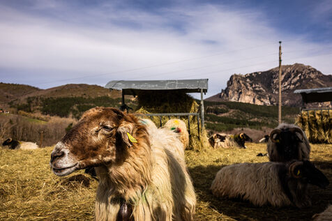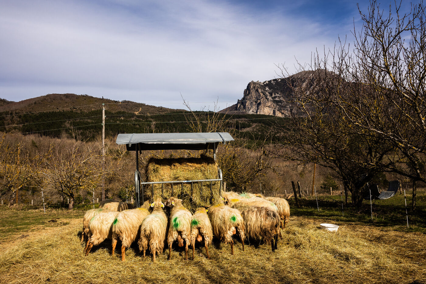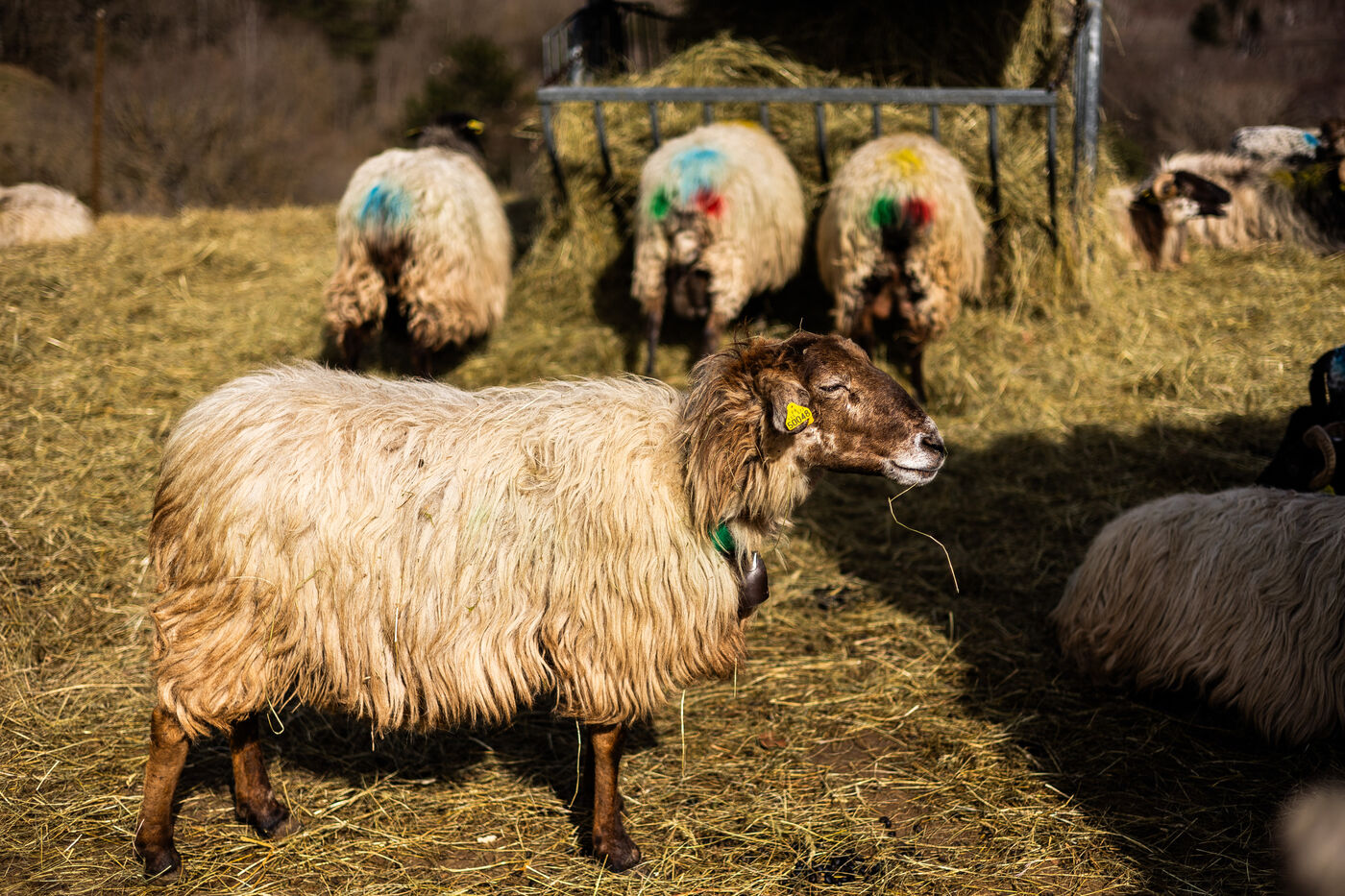 Saint Louis et Parahou, Aude, February 27, 2025, portrait of Monika, cheese-maker and breeder of Manech Tete Noire sheep in the Corbieres region, and of her bosom at GAEC La Borde, facing the Pic du Bugarach.