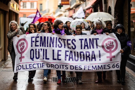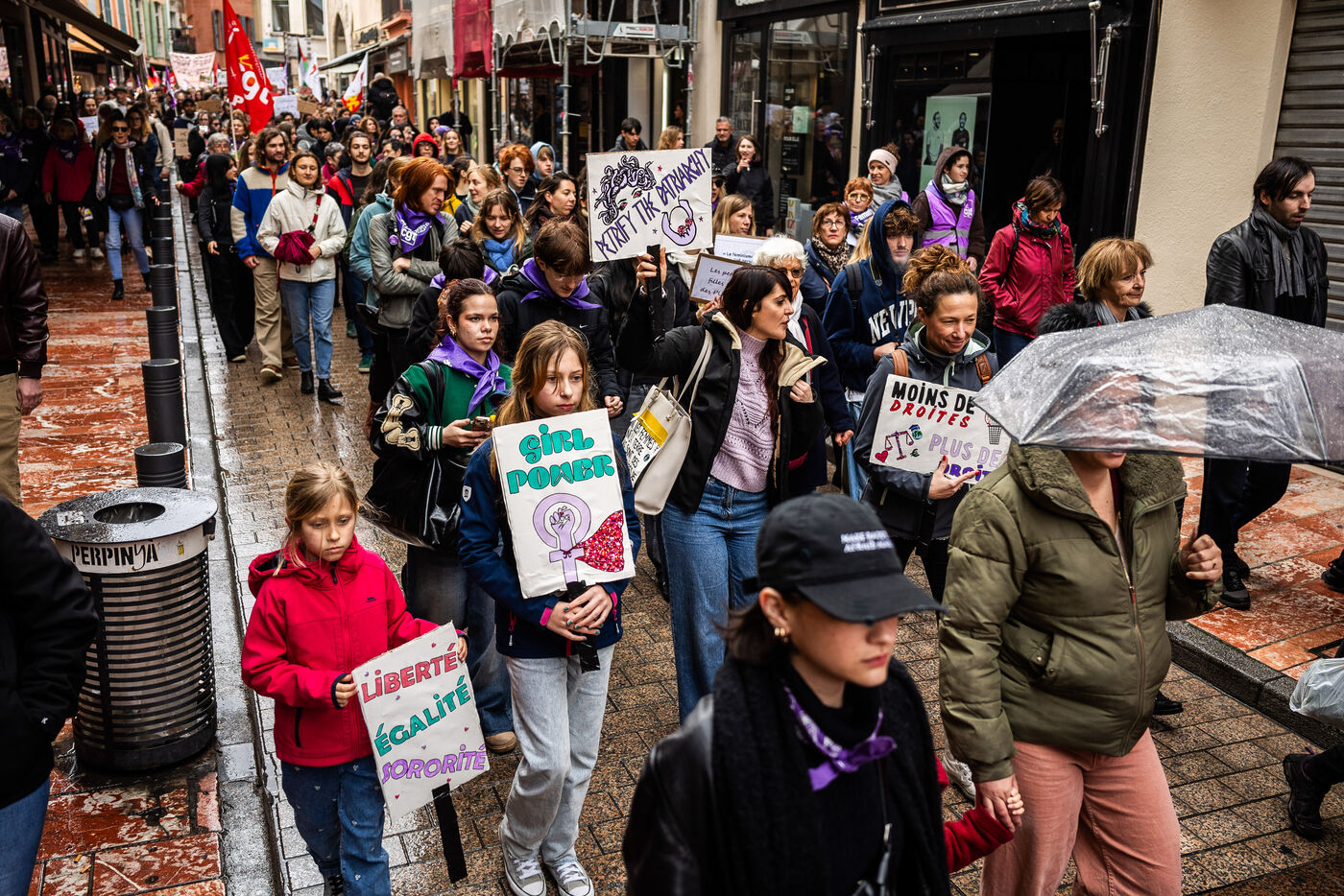 Rassemblement de plus de 500 personnes manifestant en centre ville de Perpignan avec banderoles et pancartes revendiquant l'égalité femme-homme.