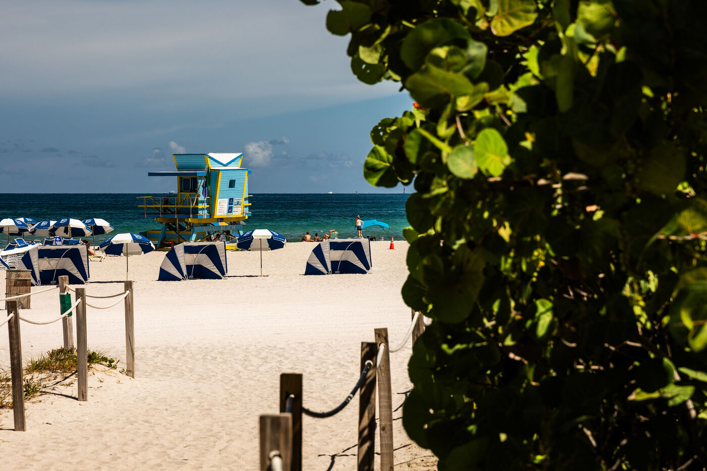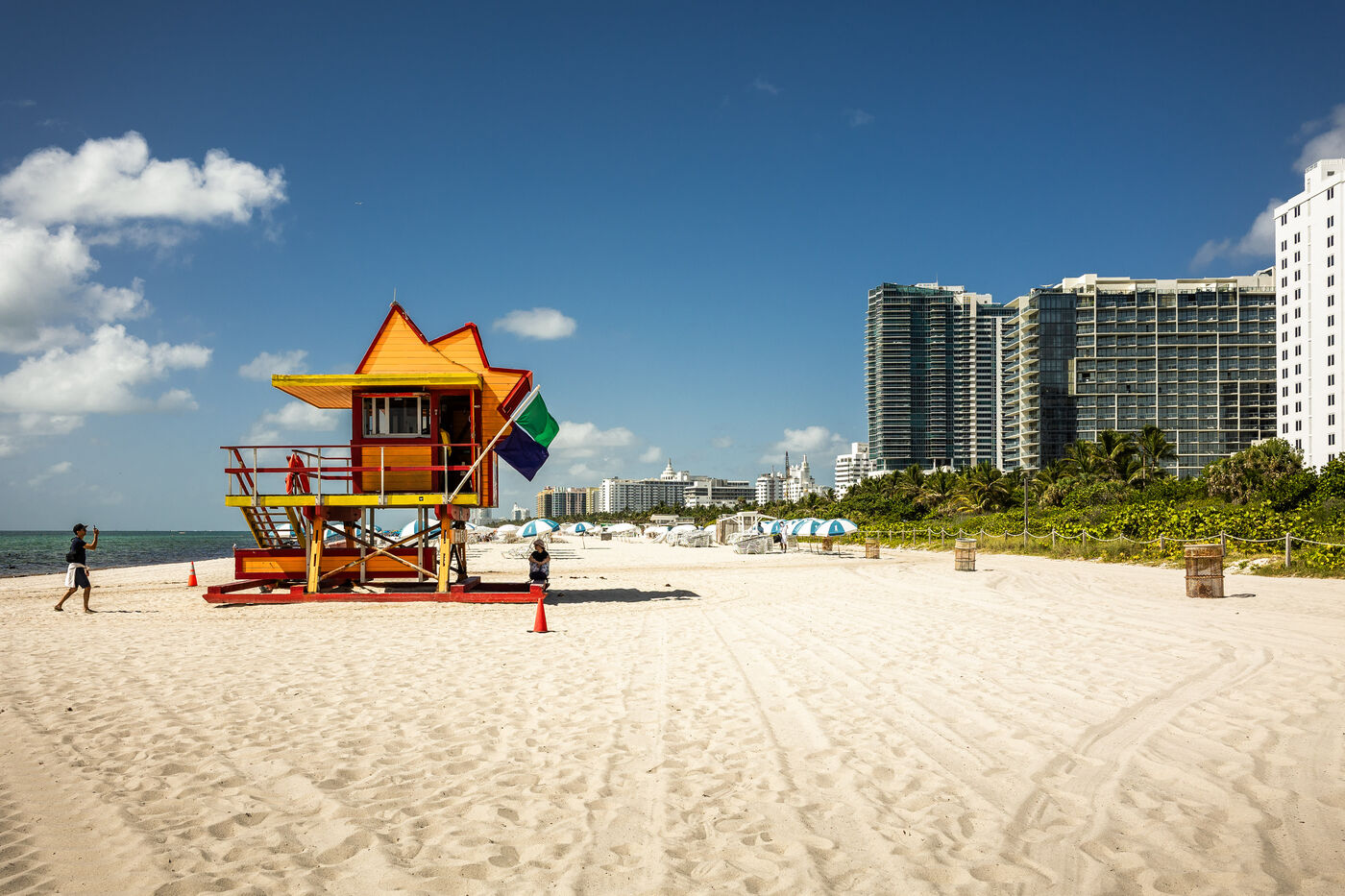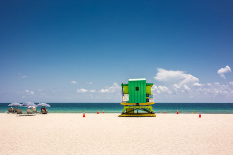 Aout 2025, Miami Beach, Floride, réactualisées en 1995 par l'architecte William Lane, les cabanes de sauveteurs colorées de Miami Beach font aujourd'hui parti du patrimoine et des icones de la ville et de sa longue plage sur l'Ocean Atlantique.