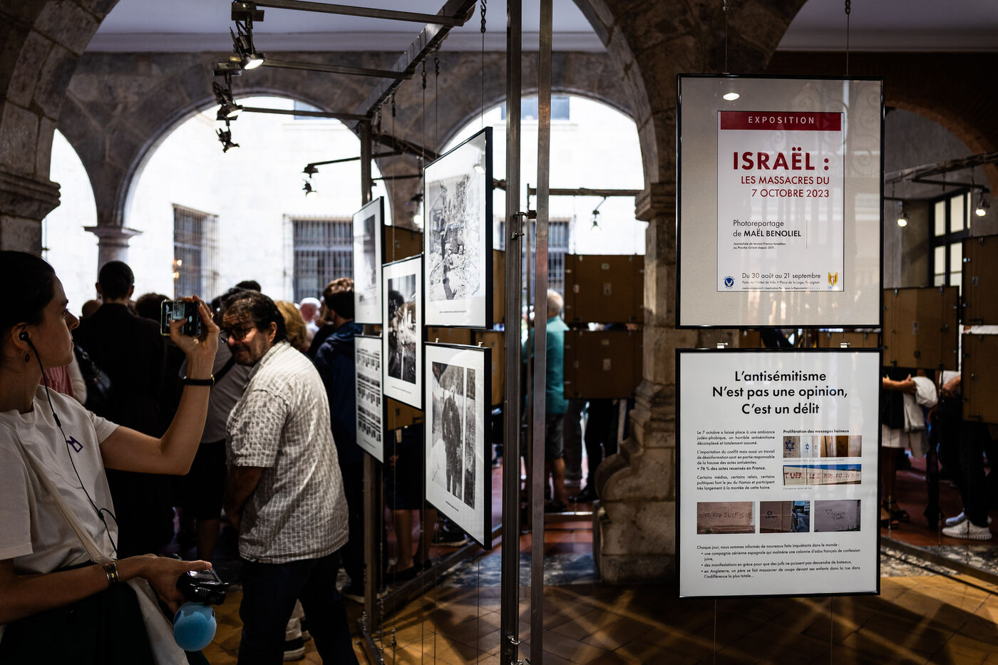 Perpignan, 29 aout 2025, profitant du lancement de la 37eme édition du festival international du photojournalisme Visa pour l'Image, la mairie de Perpignan sous l'impulsion de son maire, vice-président du RN (Rassemblement National), Louis Aliot, présente une exposition - hors festival - dans le patio de l'hotel de ville sur les massacres du 7 octobre 2023 en Israël.
