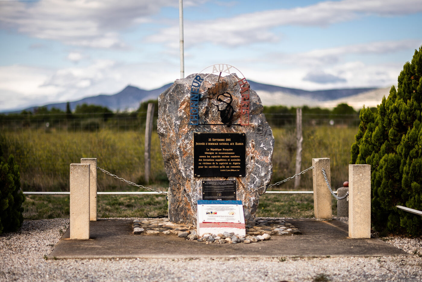 25 septembre 2025, Rivesaltes, à l'occasion de la journée nationale d'hommage aux Harkis ayant combattus dans le camps français durant la guerre d'Algérie, l'état représenté par le Préfet des Pyrénées-Orientales organisait un rassemblement devant la Stele du Souvenir Harkis du Memorial de Rivesaltes, à l'ancien Camp Joffre où ils furent "parqués" dans d'affreuses conditions à leur arrivée en France Métropolitaine, en 1962 et 1963.