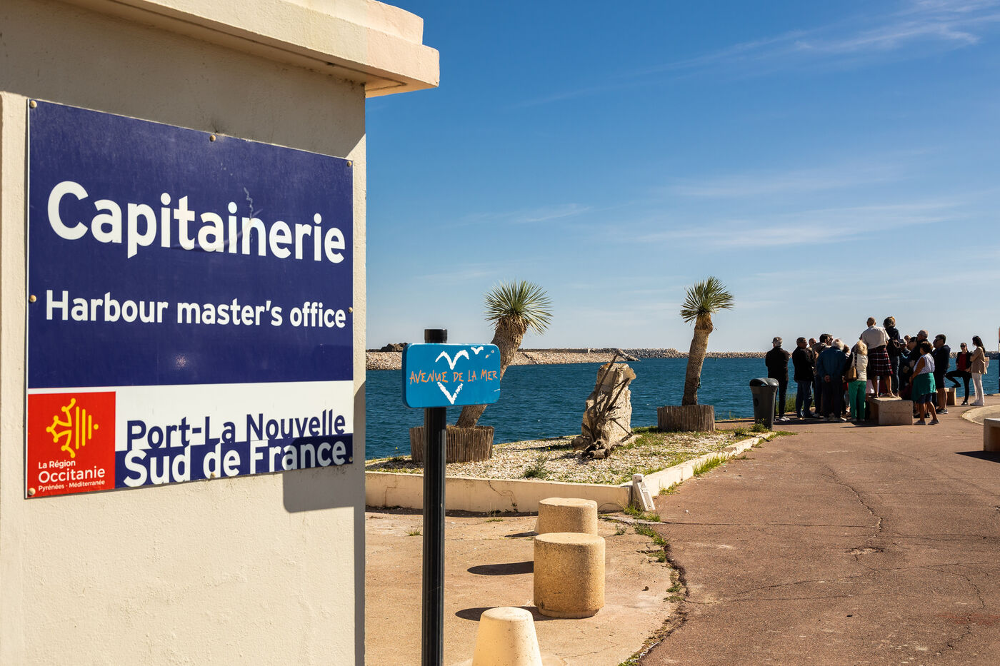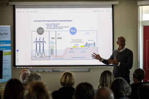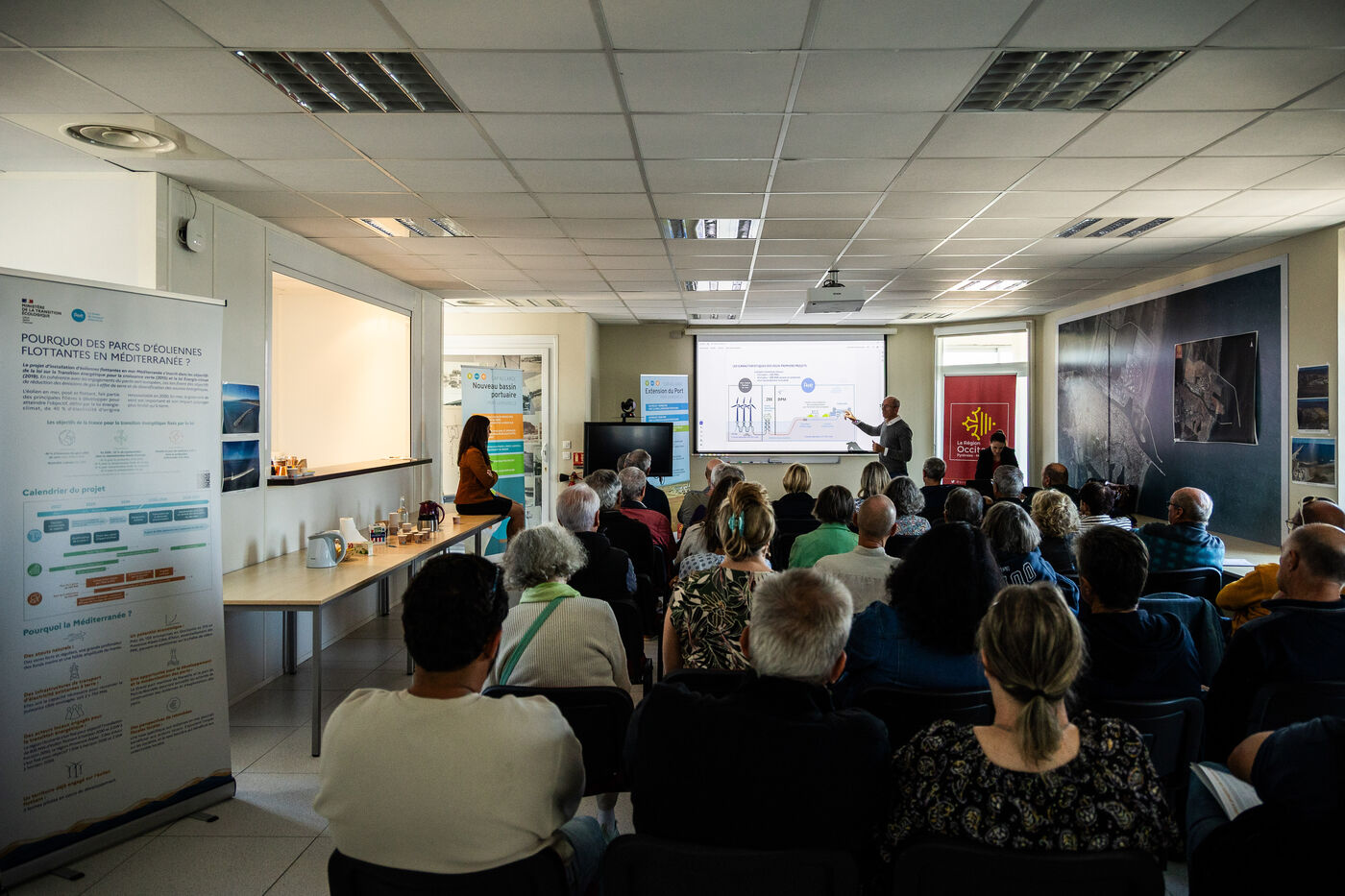 Port La Nouvelle, September 30, 2025, public meeting and tour of the offshore wind turbine assembly site for the future Gulf of Lyon Offshore Wind Farm, supported by the Occitanie Region and operated by Qair.