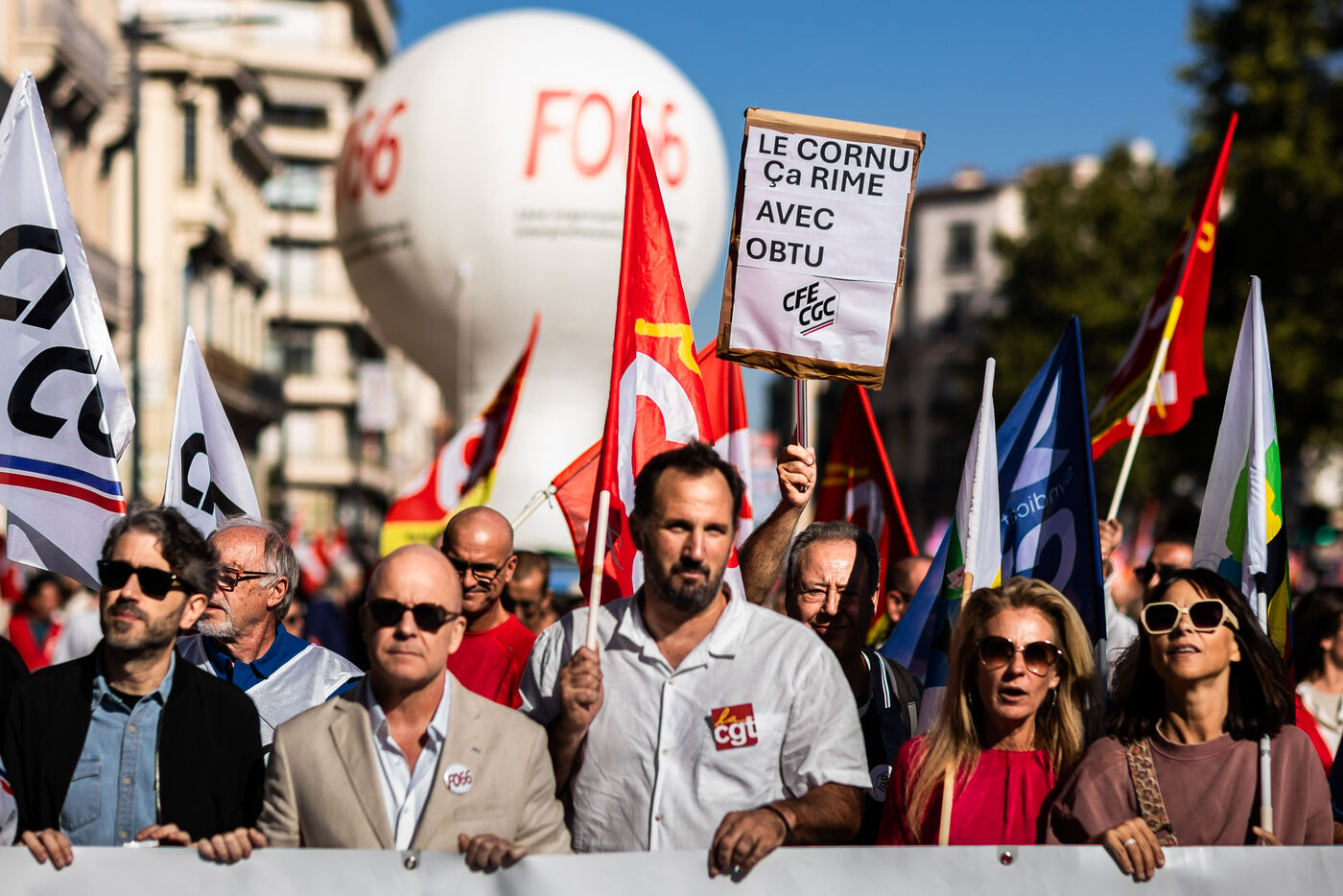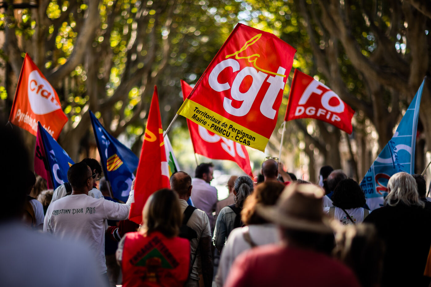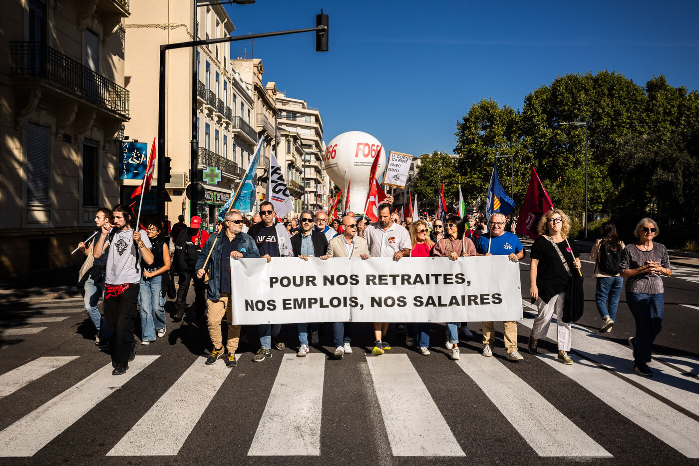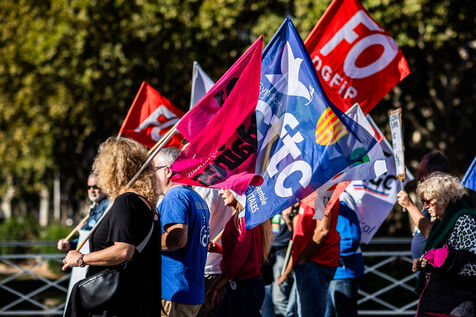 Perpignan, 2 octobre 2025, manifestation à l'appel de l'intersyndicale pour plus de justice sociale, contre le budget et l'austérité annoncés par le gouvernement. Une rentrée sociale faisant suite à la colère populaire du mouvement "Bloquons Tout le 10 septembre" et dans la continuité de la journée de mobilisation "réussie" du 18 septembre.