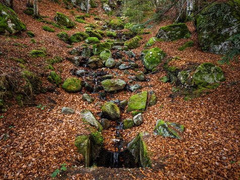 Mosset, November 16, 2025, Hike in Conflent on the 5 senses discovery trail in the Mosset communal forest, along the Còrrec de Canrec and its waterfalls, in the undergrowth, marked by the autumn season, between beech and pine forests.