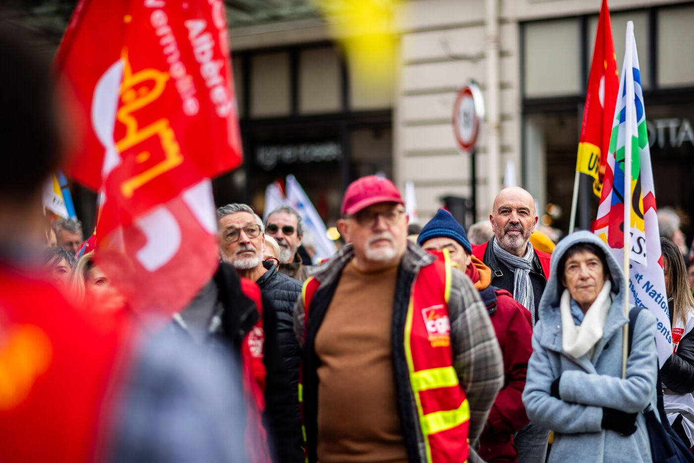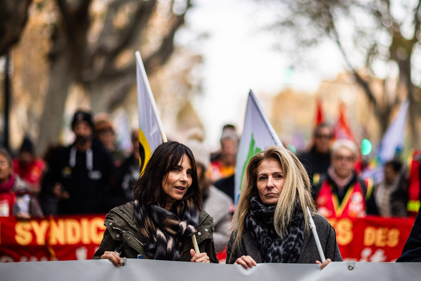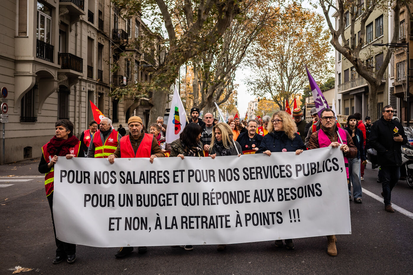 Perpignan, 2 décembre 2025, Manifestation intersyndicale à l’appel de la CGT contre le budget du gouvernement et de la Sécurité Sociale, notamment avec une alerte sur l’évolution des conditions de travail des enseignants, professeurs et la dégradation du secteur du transport public.