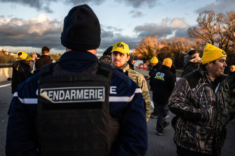 Perpignan, January 8, 2025, National demonstration by farmers from the Coordination Rurale and Confédération Paysanne unions against the Mercosur agreement and the systematic slaughter of cows for Contagious Bovine Nodular Dermatosis, with the access ramp to the A9 motorway in Perpignan Sud under heavy surveillance by the Gendarmerie and with the unexpected presence of Sebastien Chenu, deputy, vice-president of the National Assembly and vice-president of the Rassemblement National.