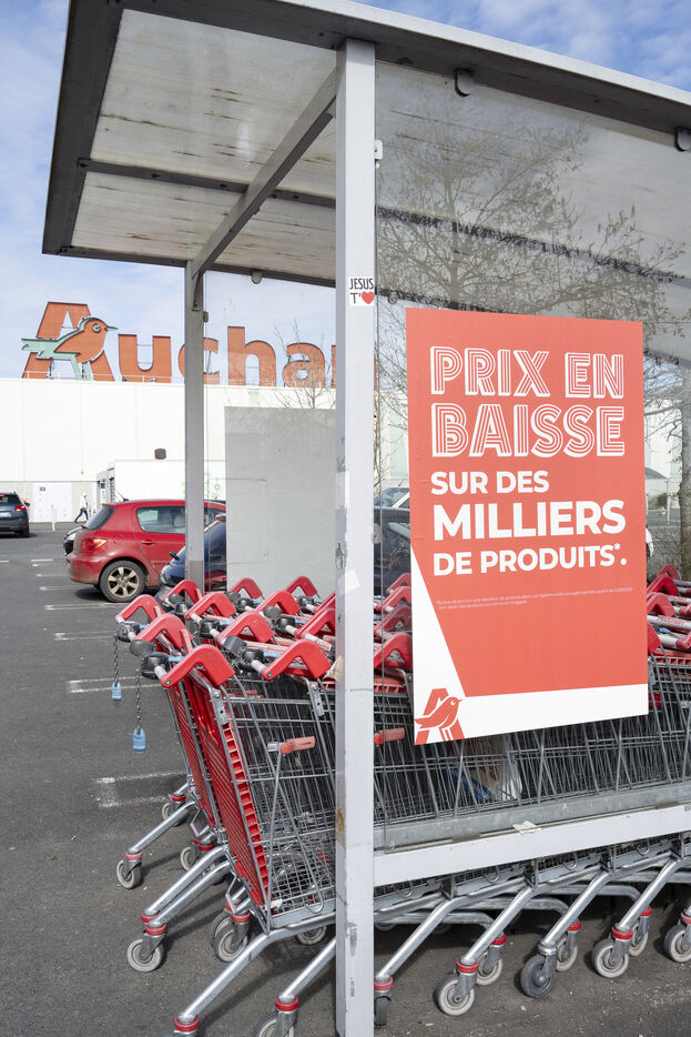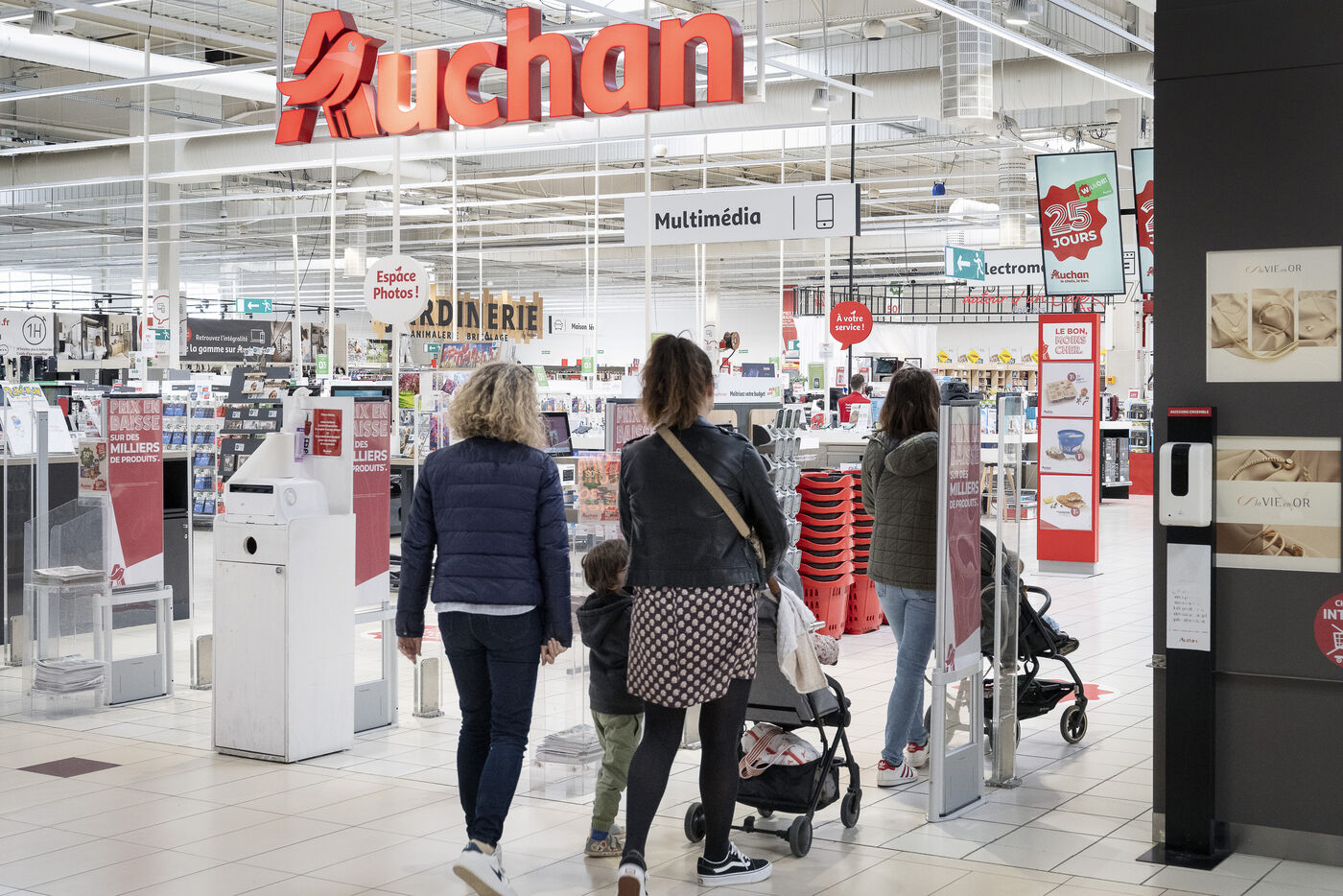Images d'illustrations d'un supermarché Auchan à Poitiers. Depuis la crise de la covid 19, les consommateurs fréquentent moins les hypermarchés, ce qui bouscule la grande distribution.