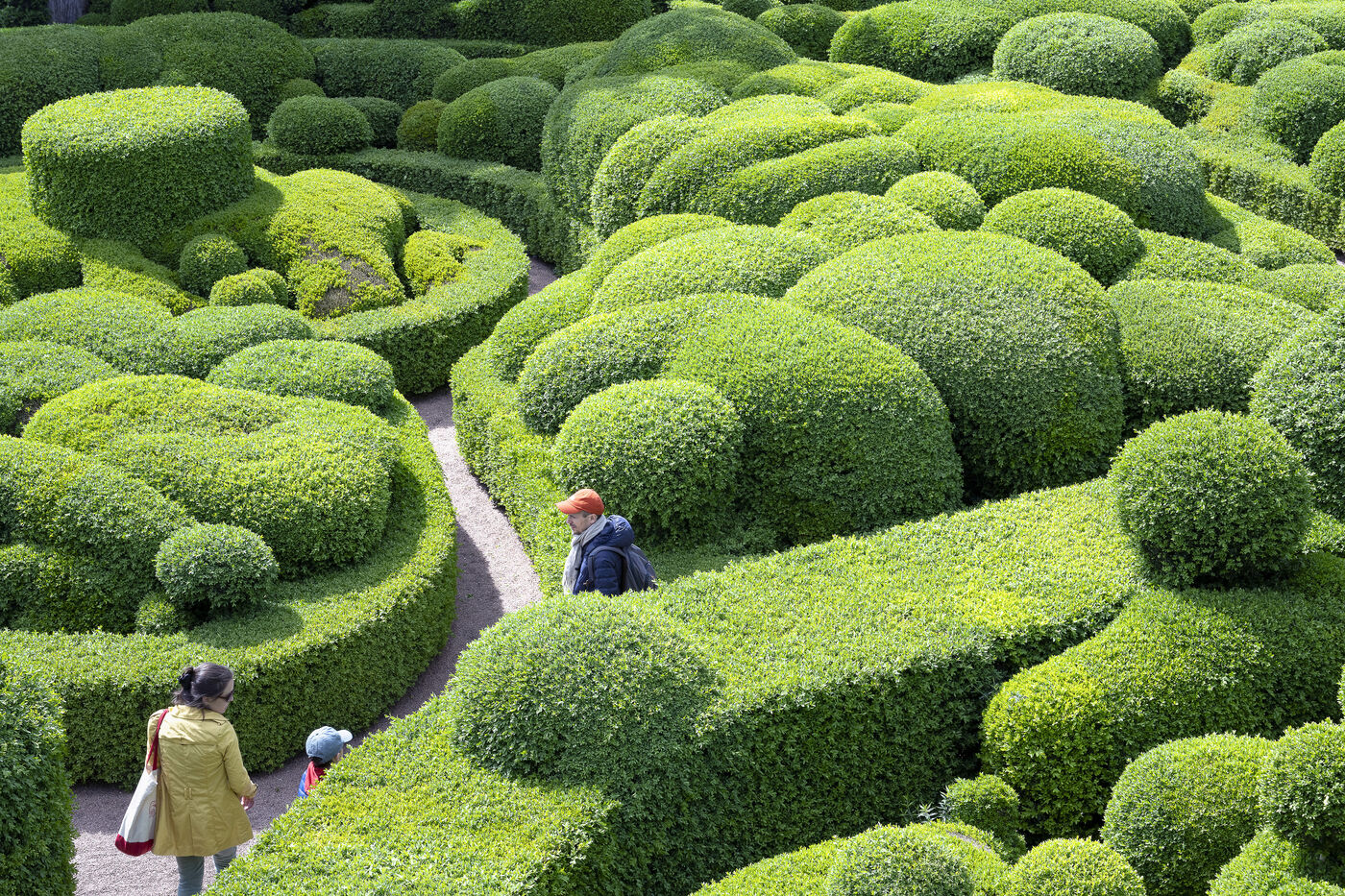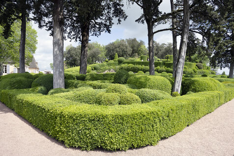 Illustration of the Chateau and gardens of Marqueyssac. The gardens are famous for their topiary art, with 150,000 hundred-year-old box trees, pruned by generations of gardeners. They form a maze of hedges and mazes offering a romantic and poetic landscape.