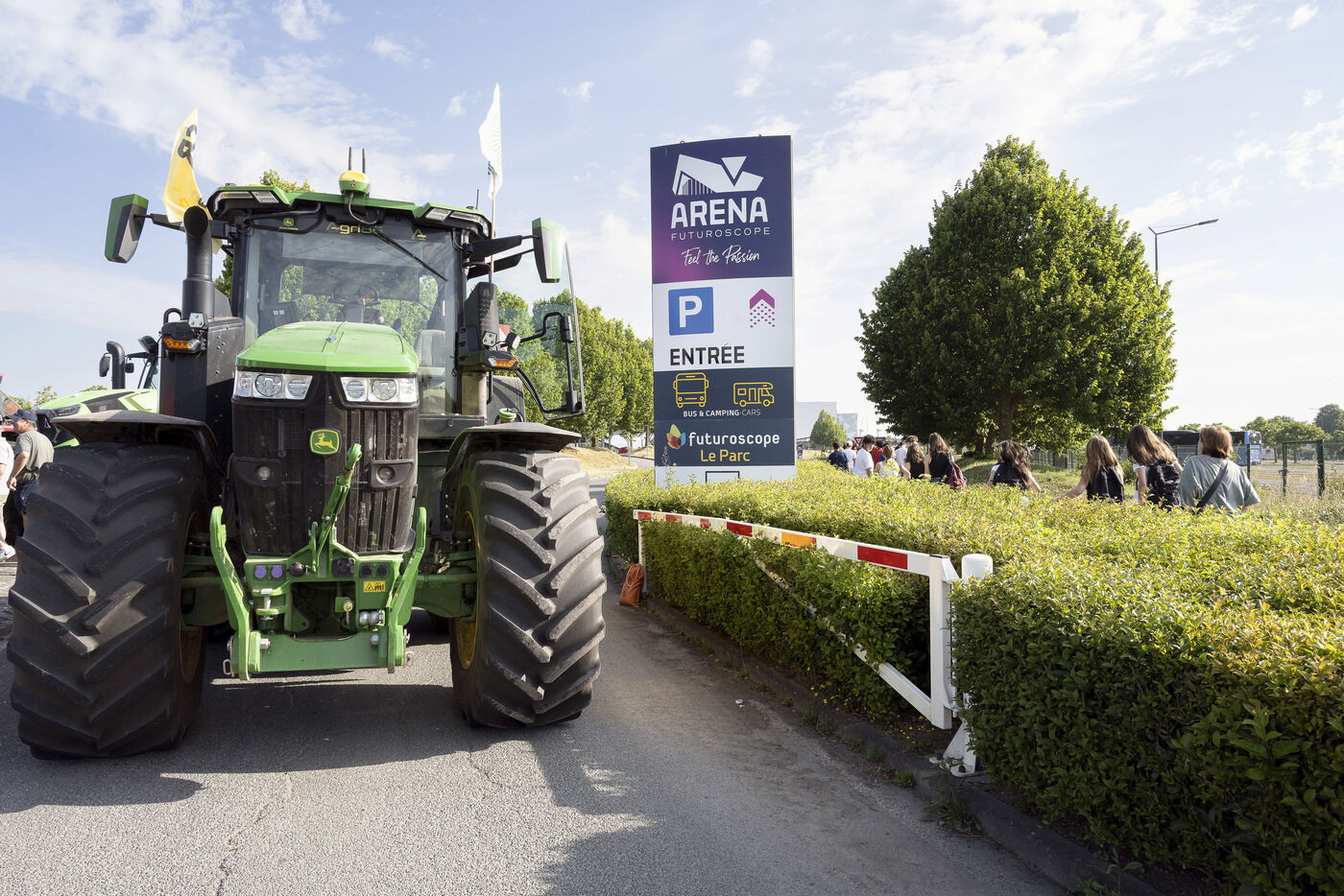 Des agriculteurs de la FNSEA, de la Coordination Rurale (CR) et des Jeunes Agriculteurs (JA) bloquent les entrées du Futuroscope pour protester contre les restrictions d'usages de l'eau qui vont peut-être leur être imposées à la suite des études du HMUC (Hydrologie, Milieux, Usages et Climat).