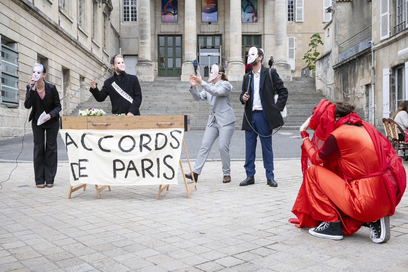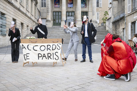 Un groupe d'activistes d'Extiction Rebellion a décidé d'enterrer symboliquement les accords de Paris en manifestant dans les rues de Poitiers avec un cercueil muni d'une banderole : Accords de Paris".