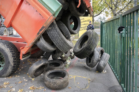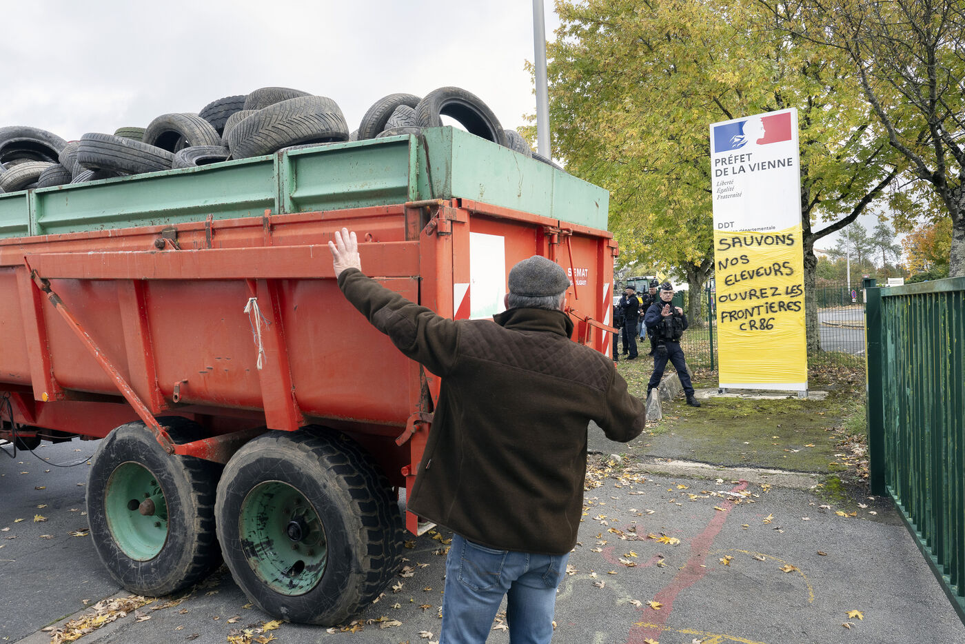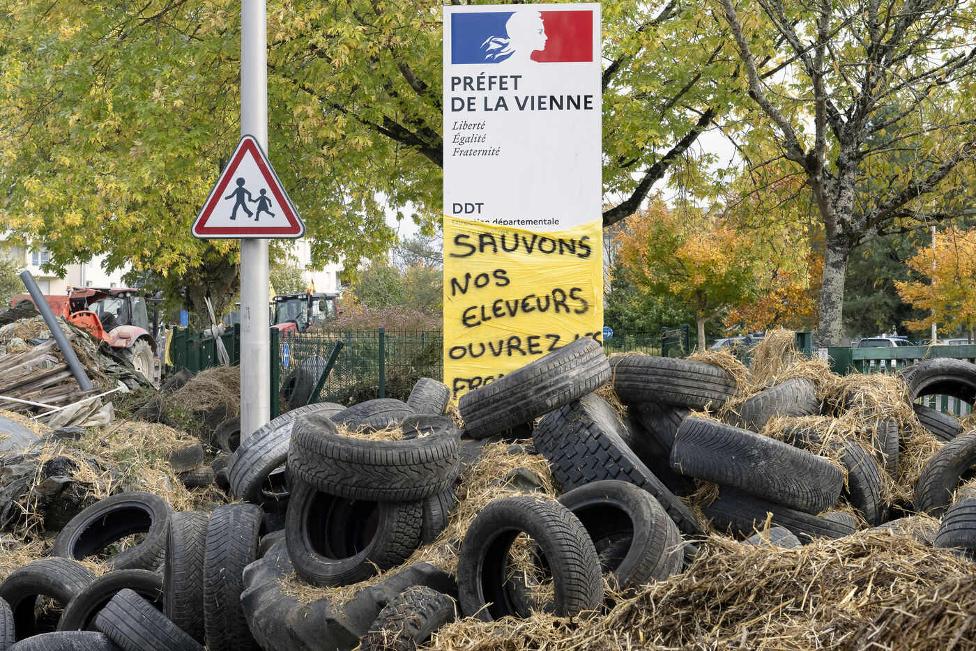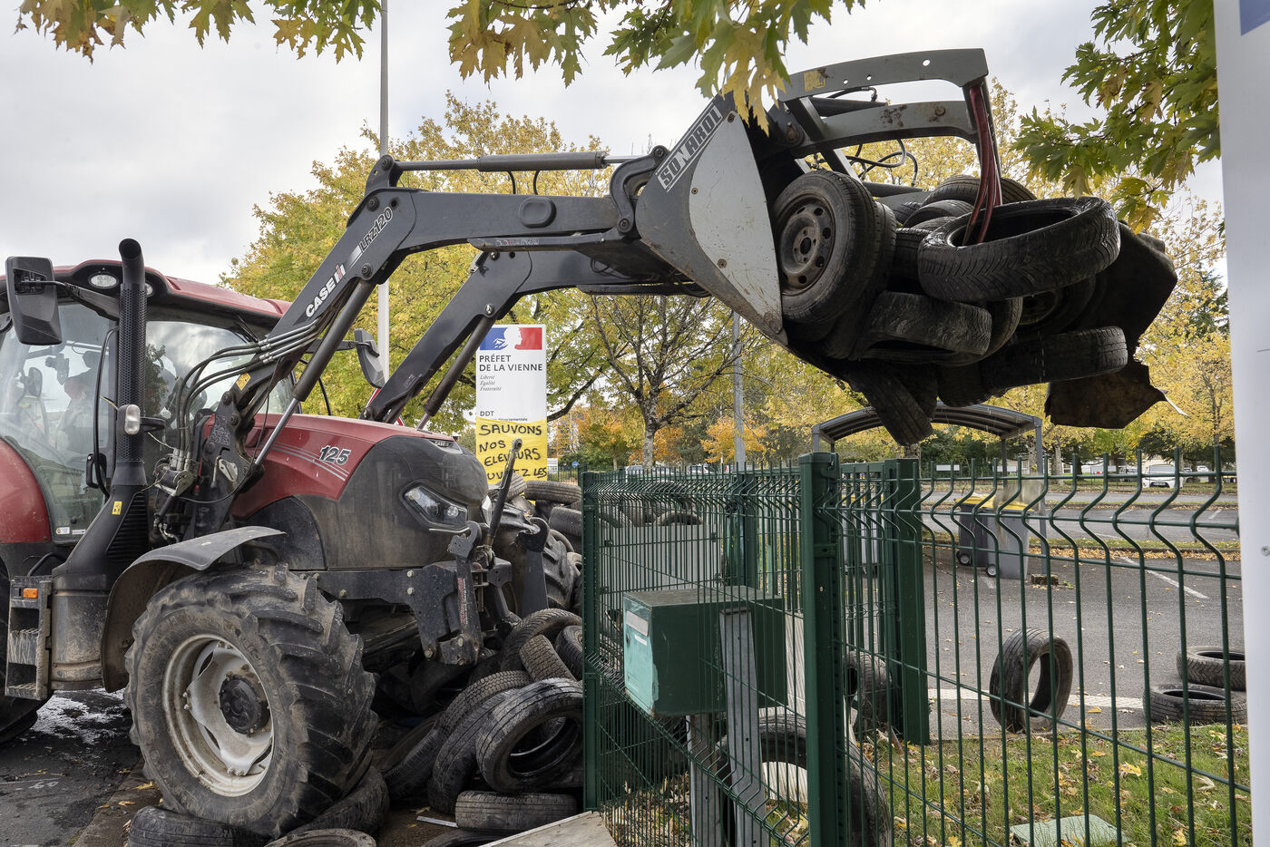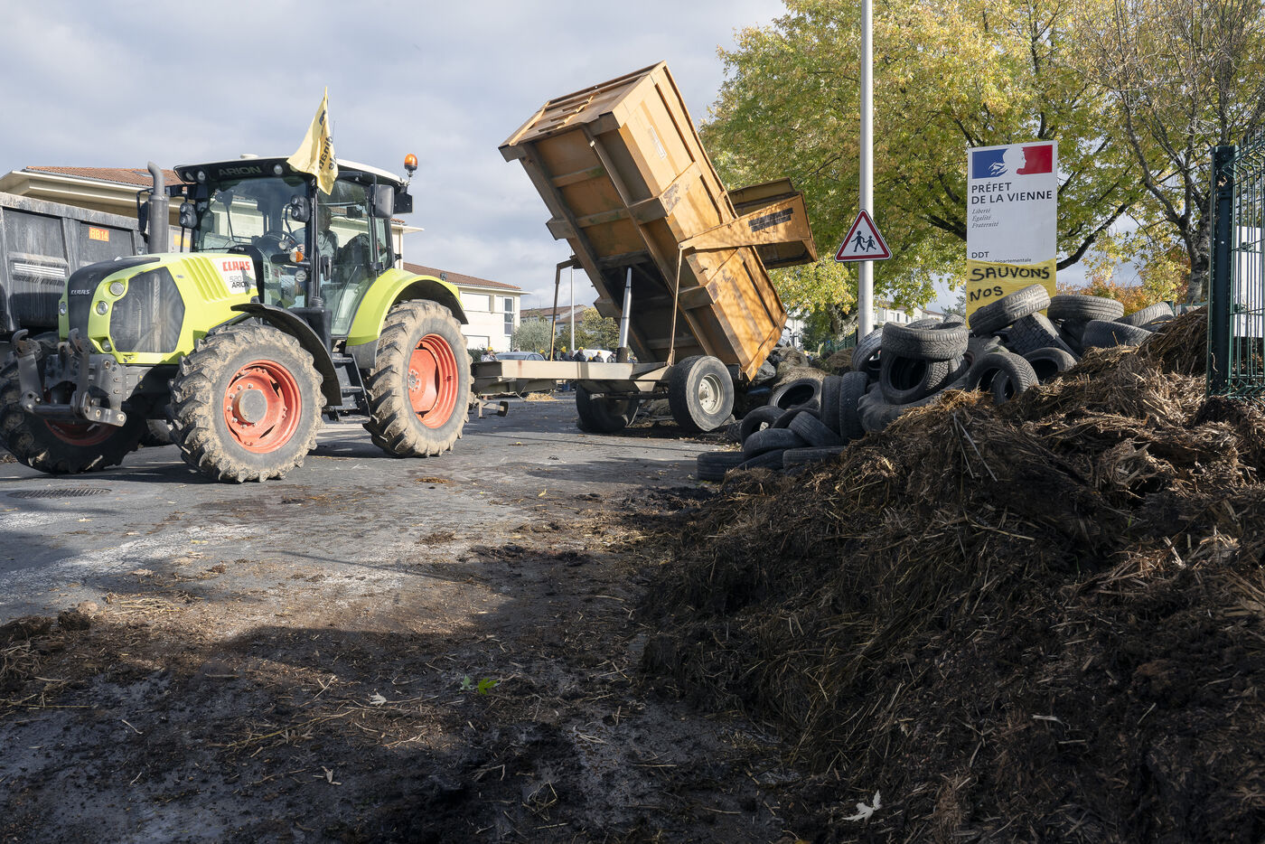 Farmers from the Syndicat Coordination Rurale (CR) organisation came to demonstrate with their tractors and trailers, dumping manure, old tyres and other rubbish in front of the premises of the Departmental Labour Directorate.