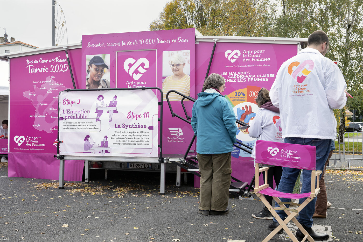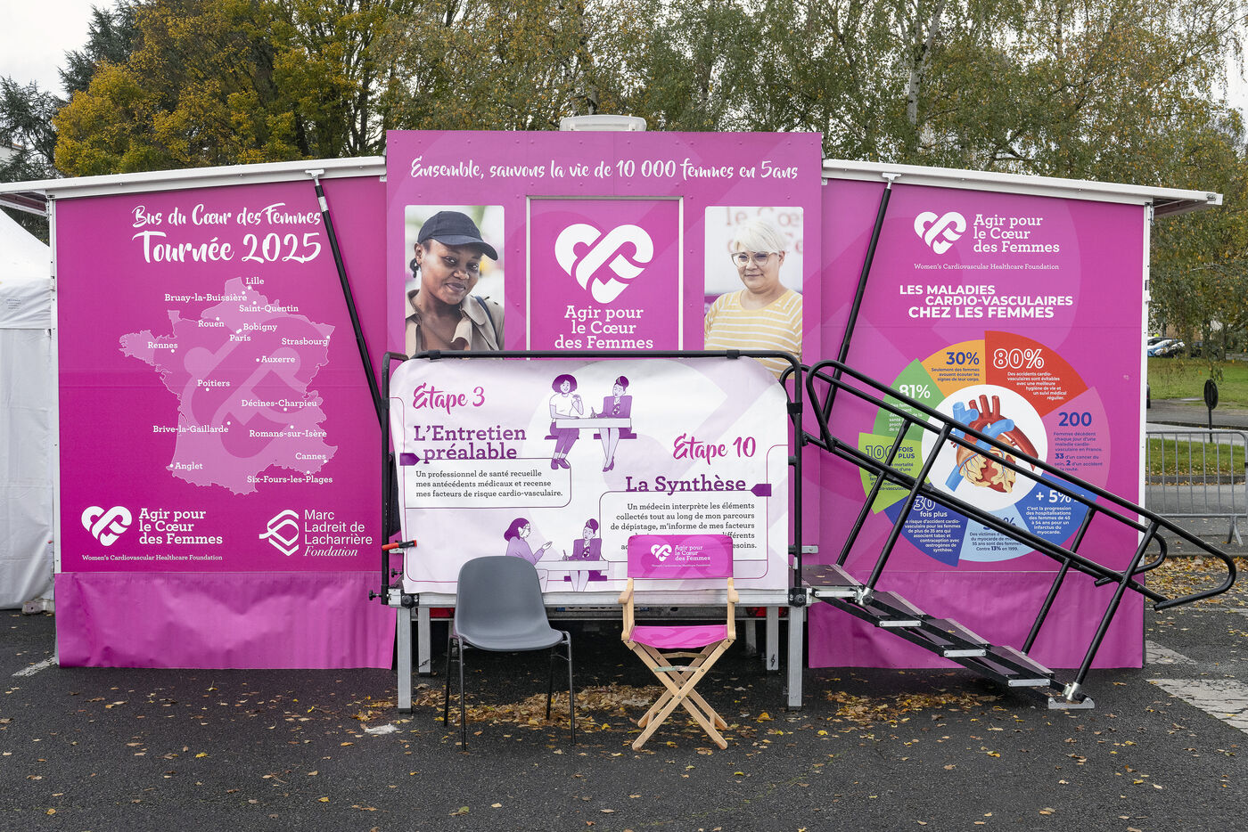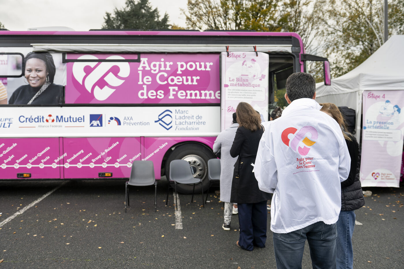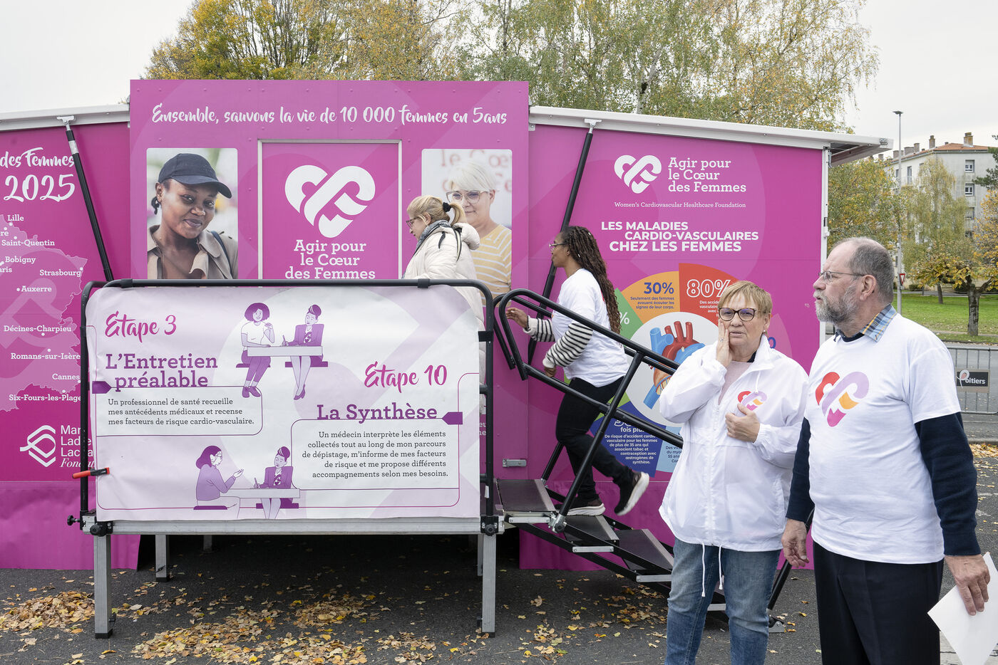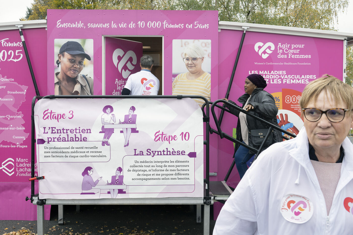 In 2001, the Agir pour le Cœur des Femmes Foundation launched the Bus du Cœur des Femmes, a mobile information, awareness and prevention initiative for cardiovascular and gynaecological diseases. The bus welcomes women in vulnerable situations, who often have limited access to healthcare, for cardiovascular and gynaecological screening.