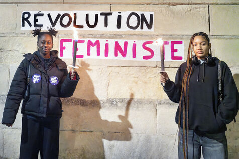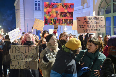 Many carried lit torches and held up cardboard signs displaying their demands and anger. Several femicides took place in Poitiers and the surrounding area in 2025.