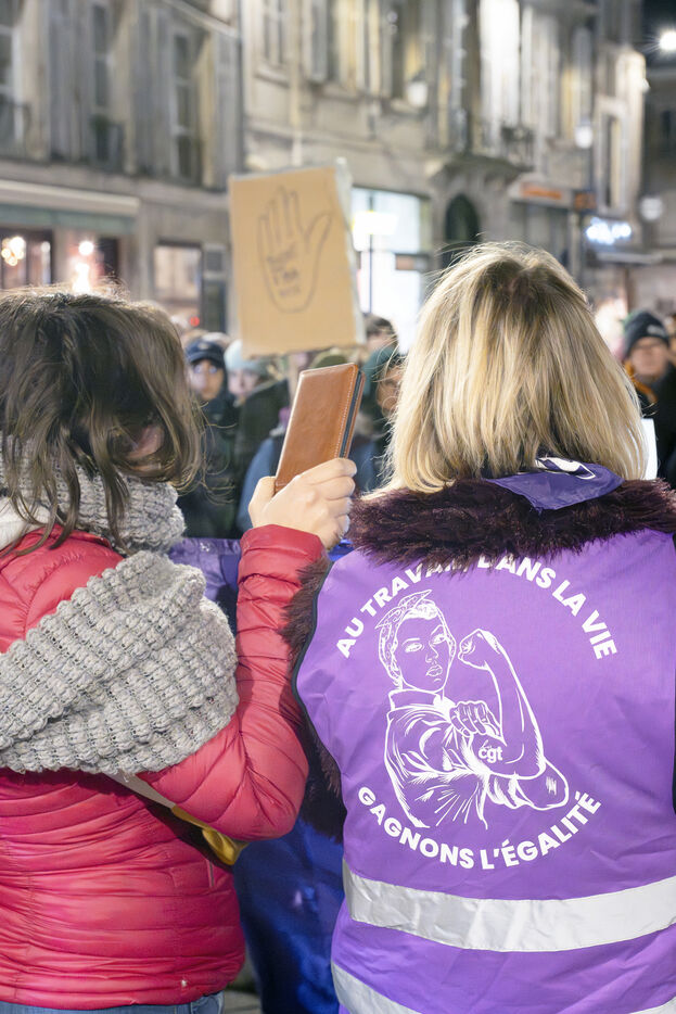 Around 250 people are protesting in the streets of downtown Poitiers on the International Day for the Elimination of Violence Against Women and various forms of gender-based and sexual violence.