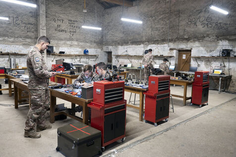 Cela se fait à l'ukrainienne, avec des pièces du commerce, des cartes électroniques modifiées par l'armée et de simples outils de bricoleurs, dans une vieille grange peu confortable.
