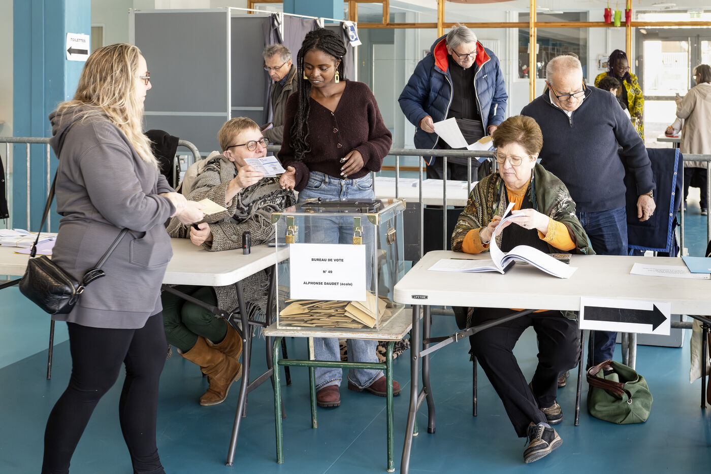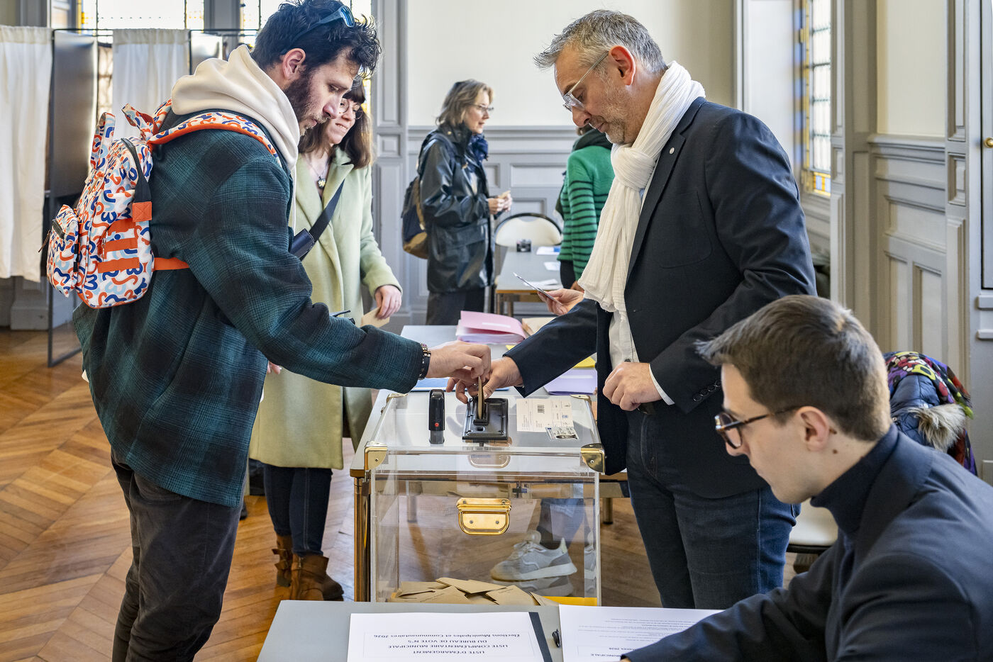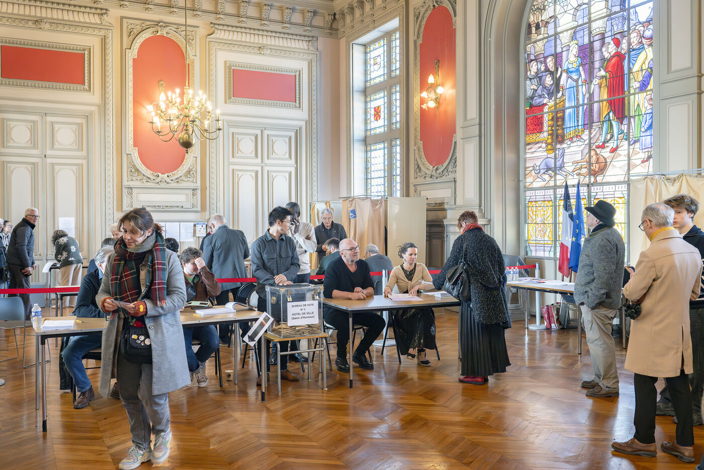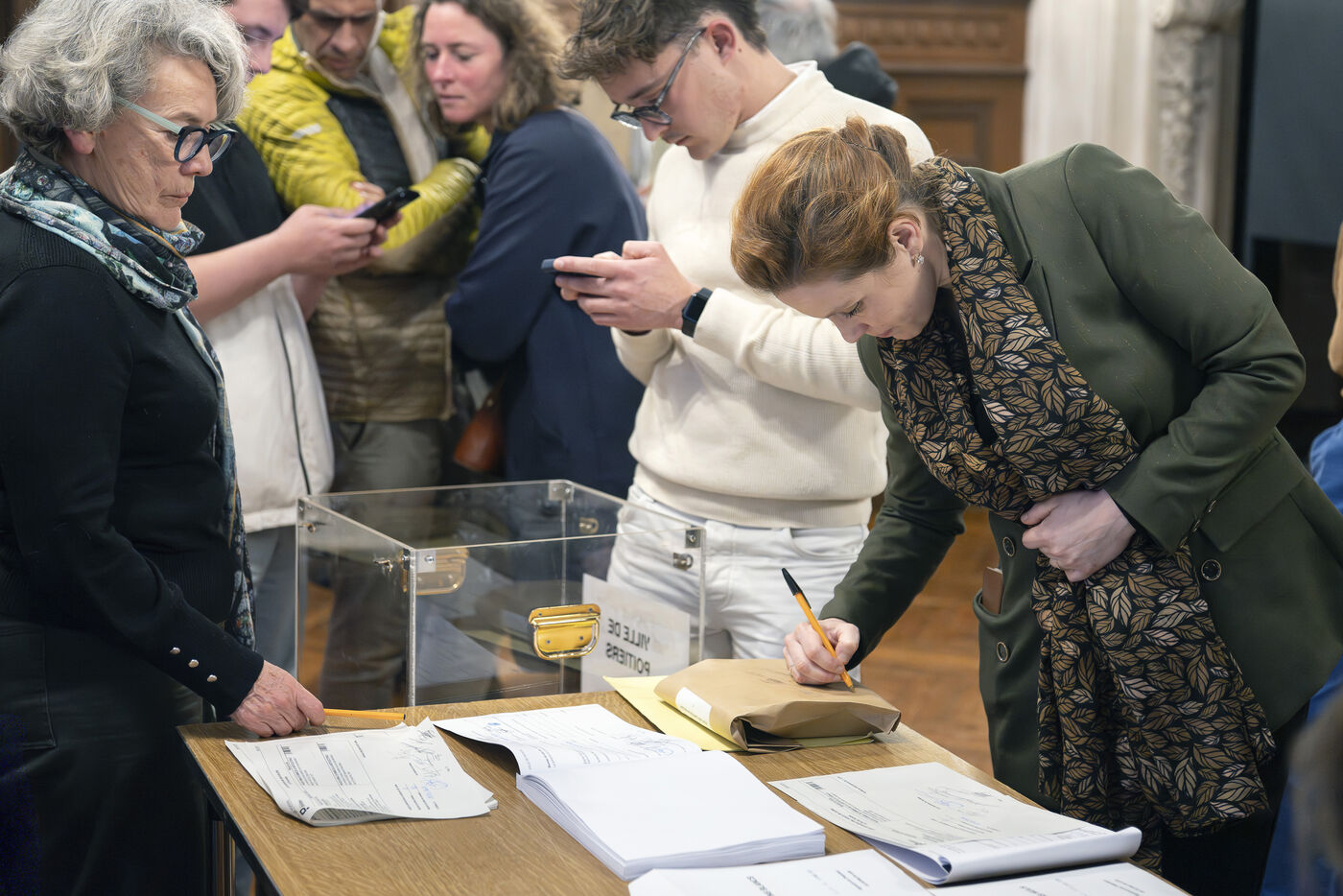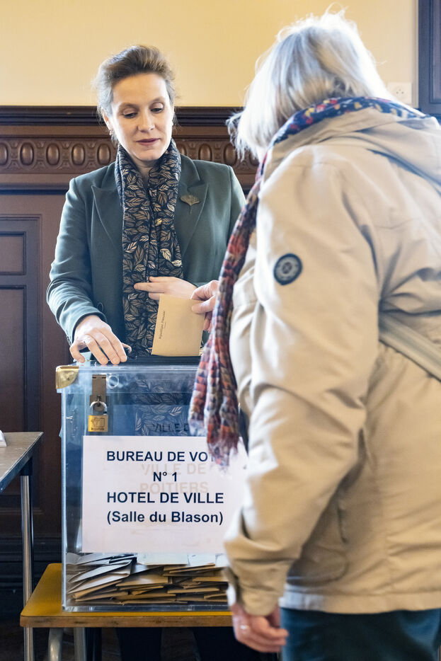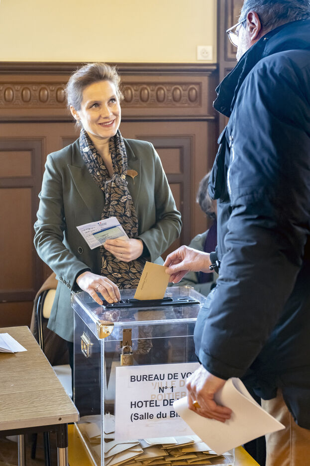 Images d'illustrations du premier tour des élections municipales 2026 dans plusieurs bureaux de votes de Poitiers, où la maire écologiste sortante Léonore Moncond'huy est candidate à sa réélection.