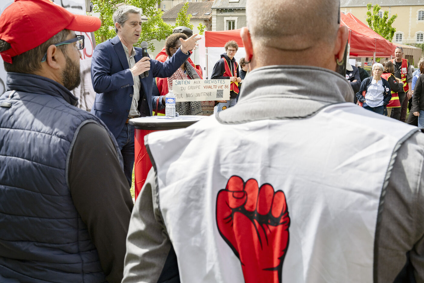 MP François Ruffin is visiting Poitiers to show his support for striking caregivers at nursing homes operated by the private Vivalto Vie group.