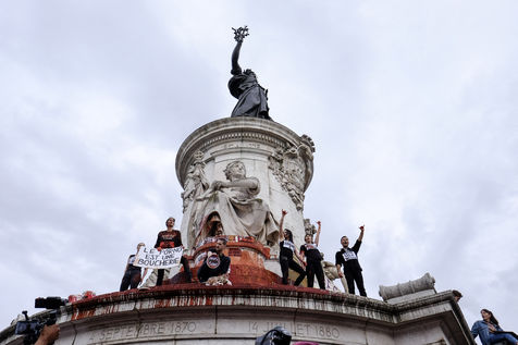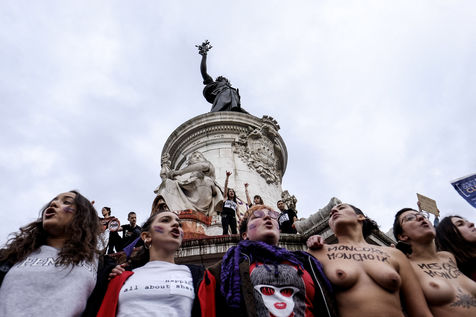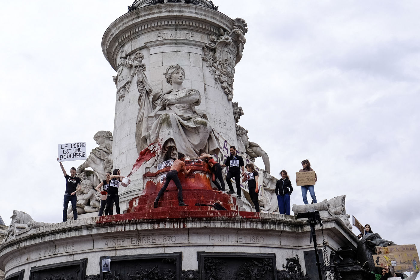 Place de la Republique in Paris, about a thousand people gathered to mark the day of women's rights. While anti-porn activists have been provocative in throwing red paint on two young naked women, other feminist groups are chanting slogans and distributing leaflets.