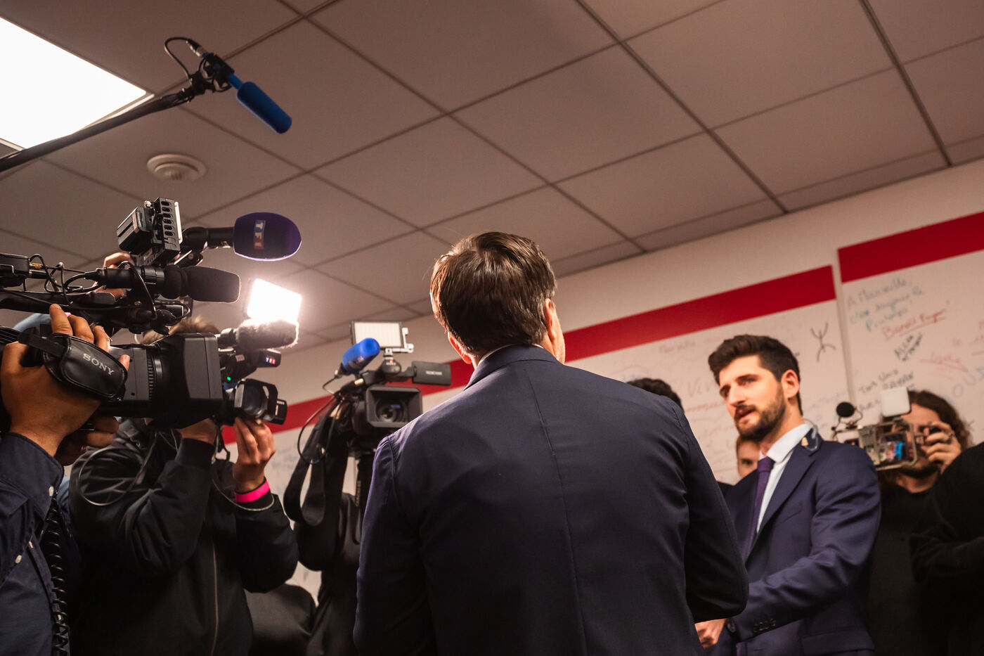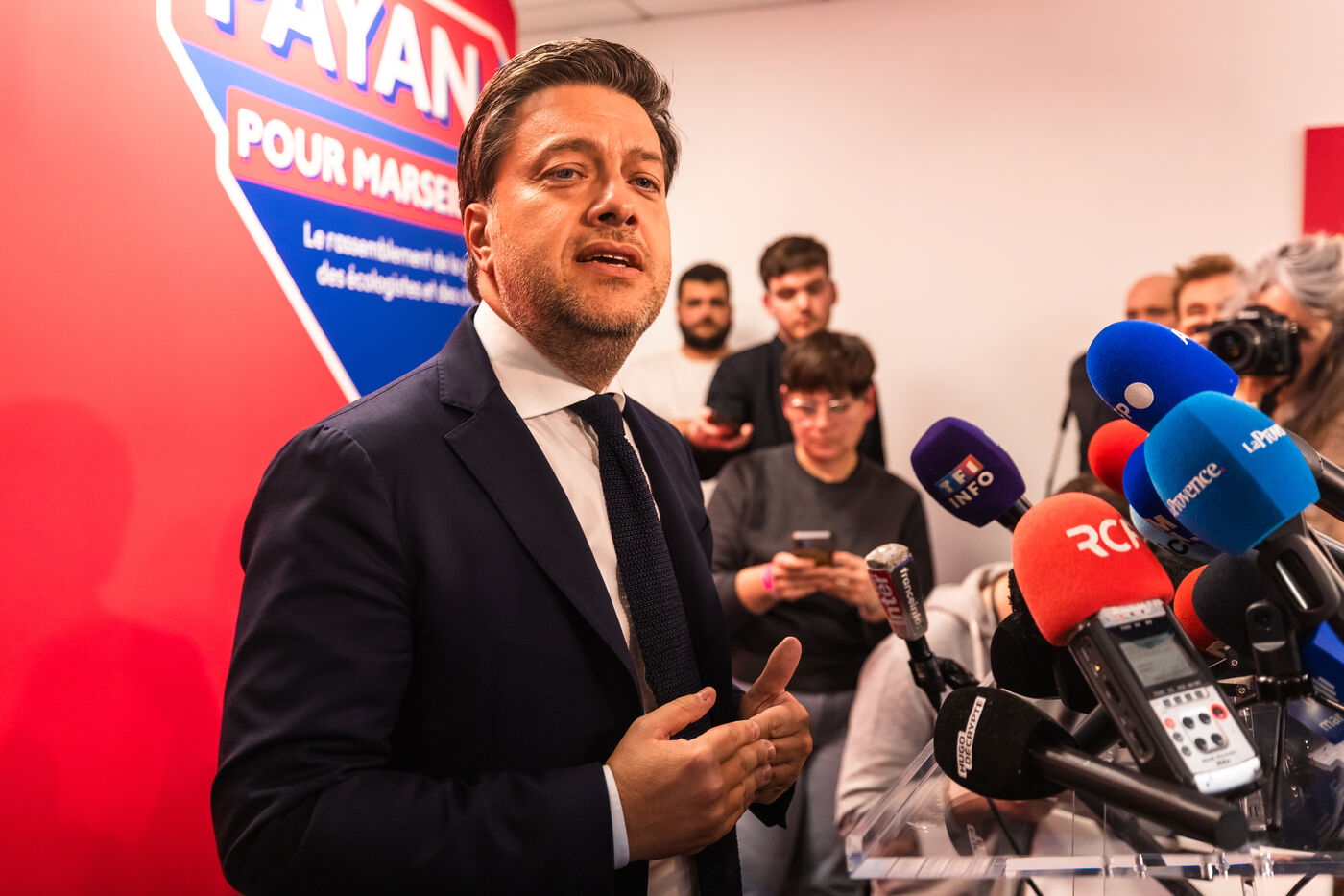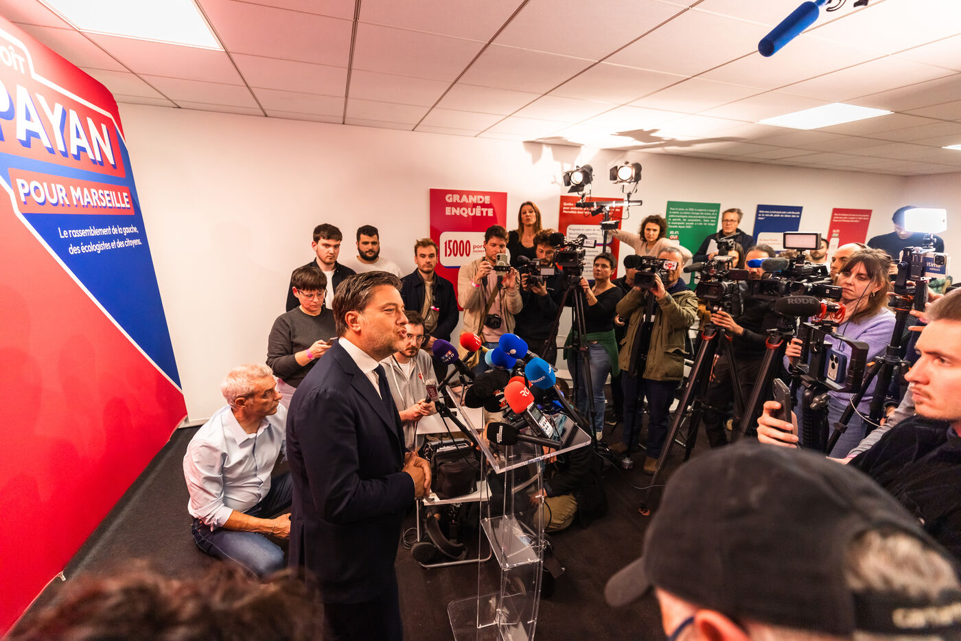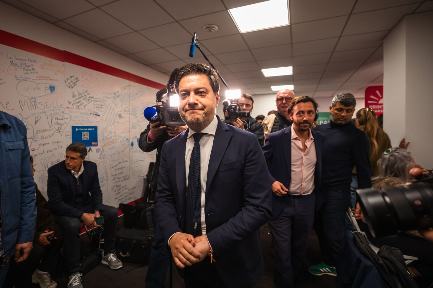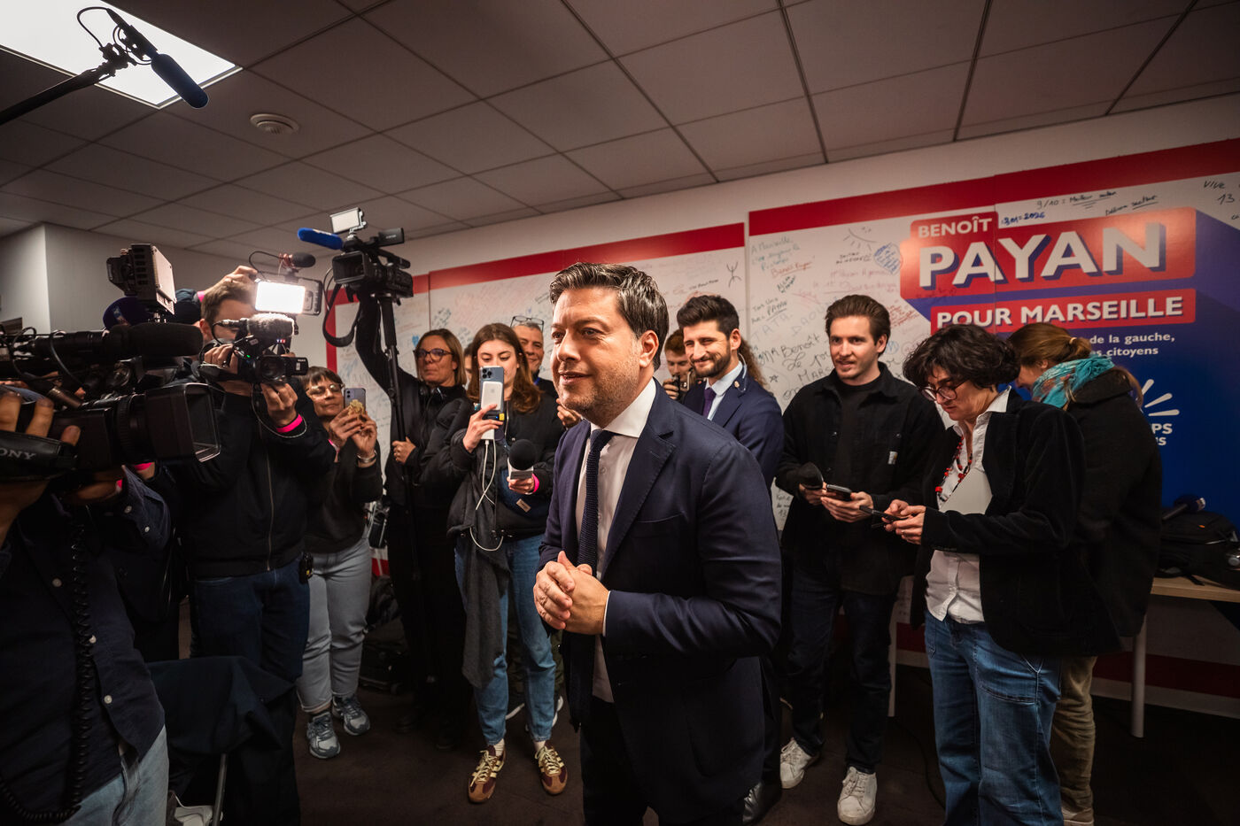 Election night at the Printemps Marseillais campaign headquarters, featuring remarks by Benoît Payan—mayor of Marseille since 2020 and the left-wing coalition’s lead candidate for the 2026 municipal elections—following the announcement of the first-round results