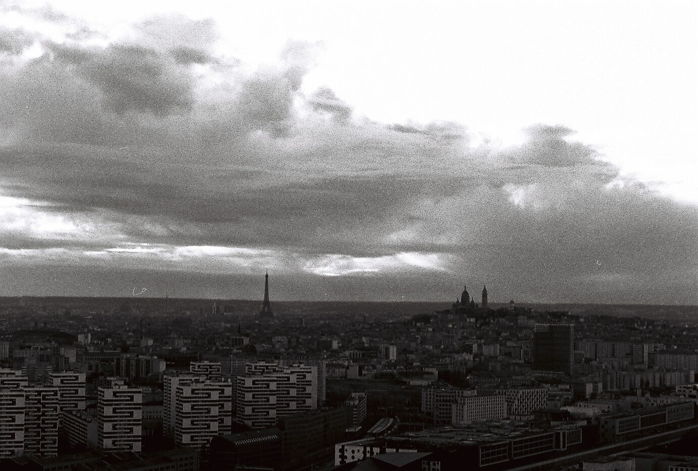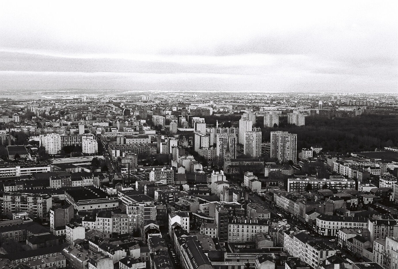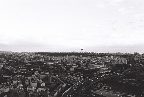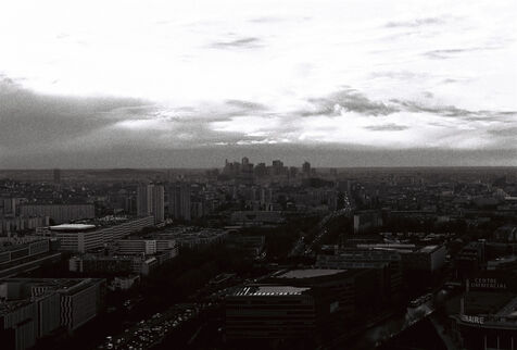 Cette série en noir et blanc, capturée sur pellicule argentique, immortalise la tour Eurasia non comme un simple point de repère du 19e arrondissement, mais comme un poste d’observation privilégié sur les fractures et les continuités urbaines de la capitale. Loin du traitement lissé du numérique, le grain de la pellicule accentue la texture brute des façades et dramatise les jeux d’ombre et de lumière qui sculptent le paysage.