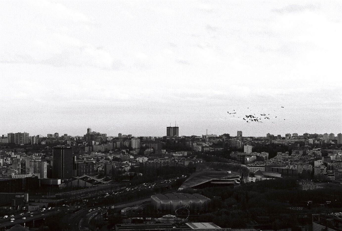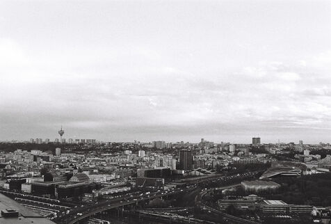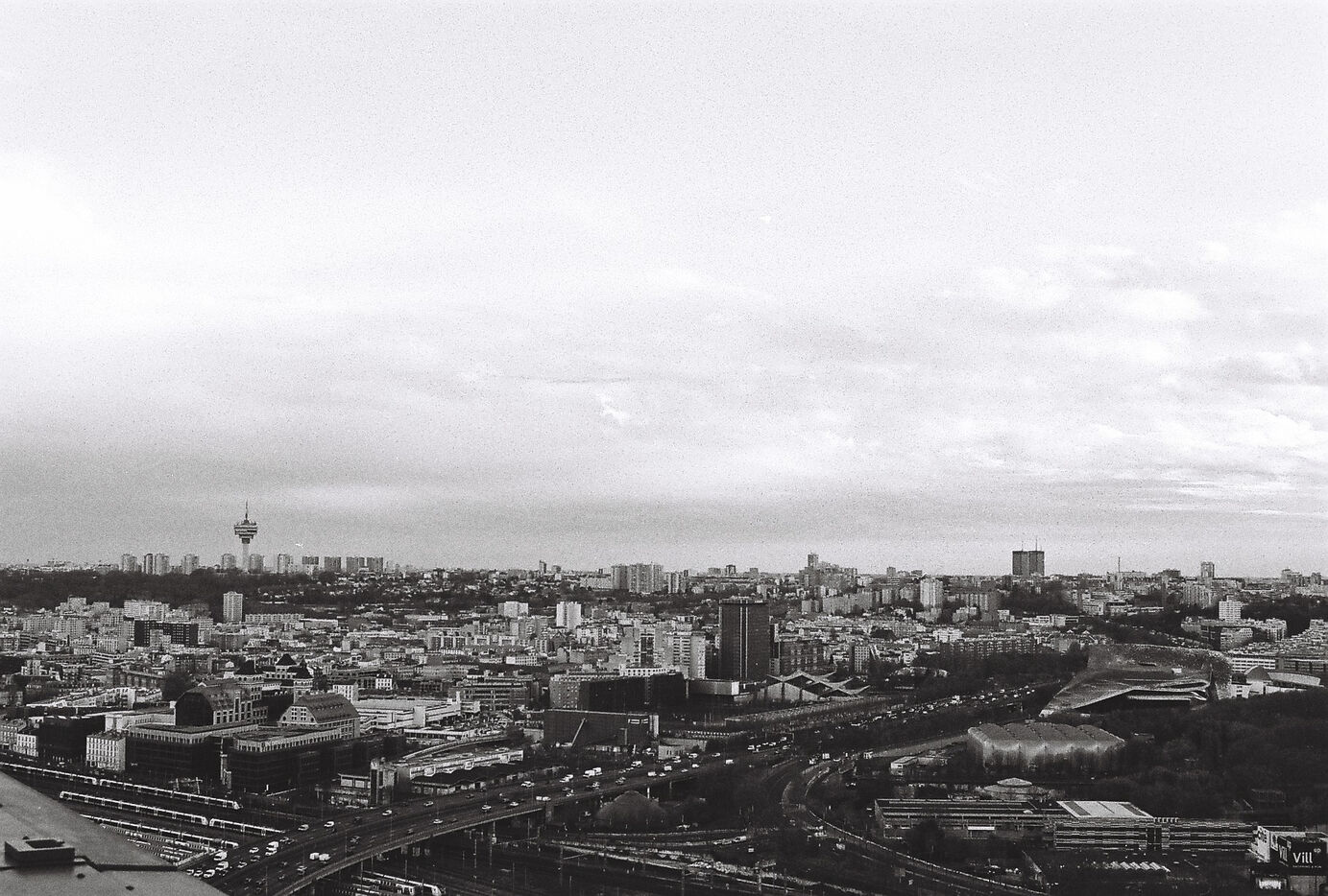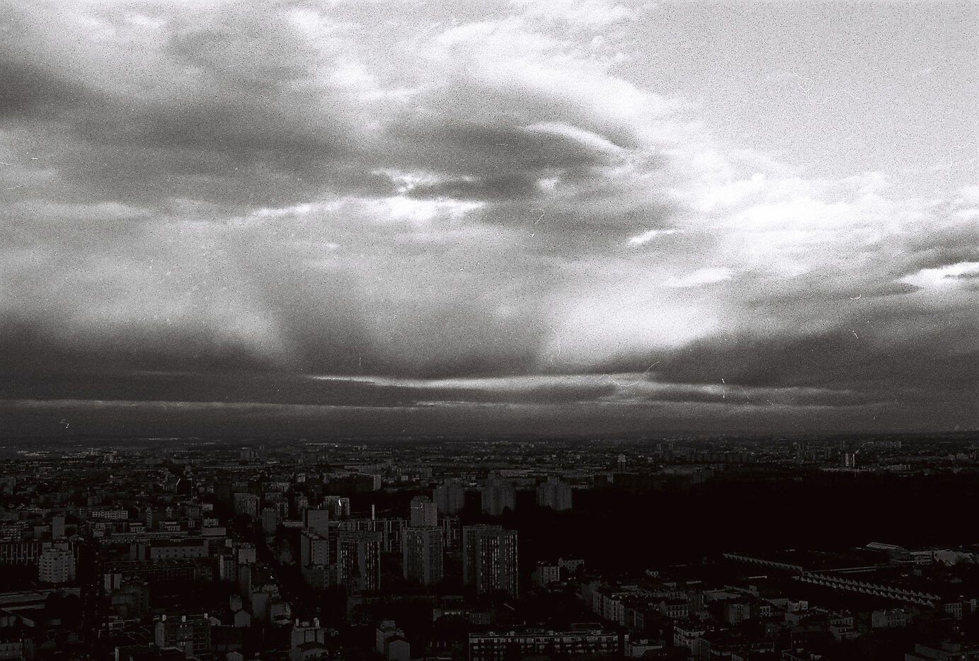 Cette série en noir et blanc, capturée sur pellicule argentique, immortalise la tour Eurasia non comme un simple point de repère du 19e arrondissement, mais comme un poste d’observation privilégié sur les fractures et les continuités urbaines de la capitale. Loin du traitement lissé du numérique, le grain de la pellicule accentue la texture brute des façades et dramatise les jeux d’ombre et de lumière qui sculptent le paysage.