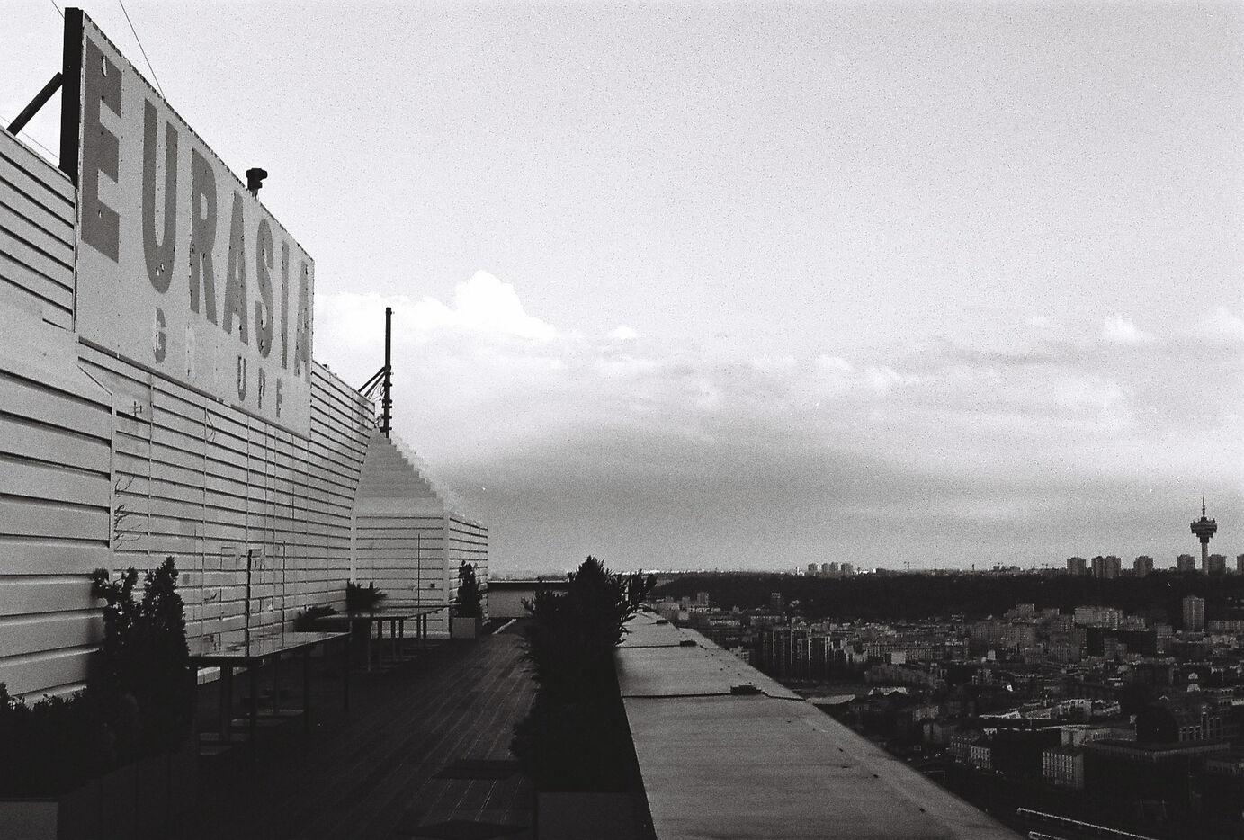 Captured on analog film, this black-and-white series immortalizes the Eurasia Tower not merely as a landmark of the 19th arrondissement, but as a strategic vantage point overlooking the urban fractures and continuities of the capital. Far from the smoothed aesthetic of digital imagery, the film grain accentuates the raw texture of the facades and dramatizes the interplay of light and shadow sculpting the landscape.