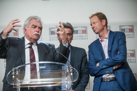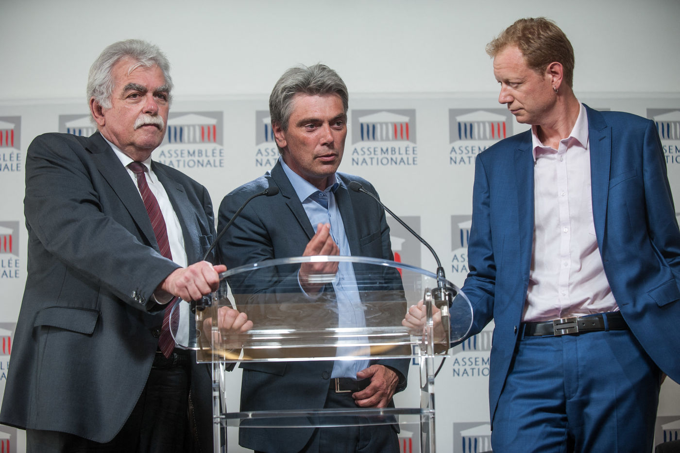 21 juin 2017 Paris . rentrée parlemntaire. Conférence de presse des députés communistes pour annoncer la formation d'un groupe communiste , indépendant du groupe FI, néanmoins partenaire et allié. , SEBASTIEN JUMEL , PIERRE DHAREVILLE, ANDRE CHASSAIGNE.