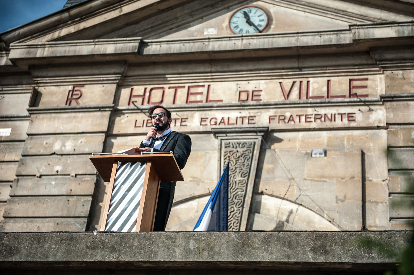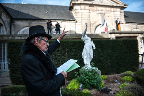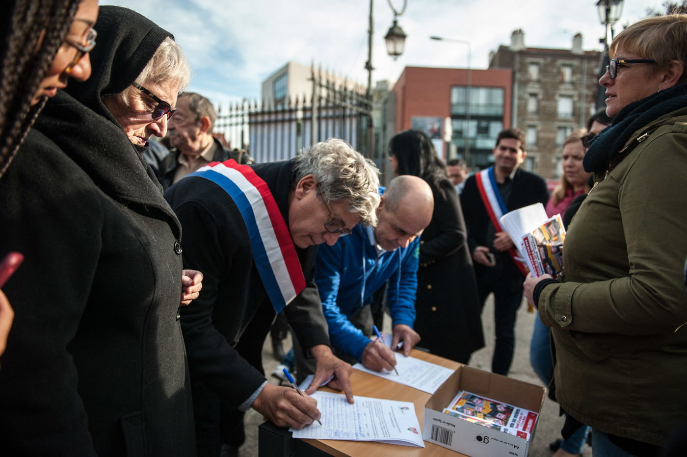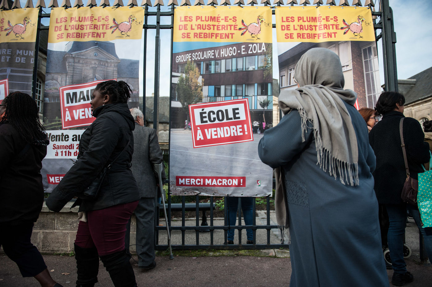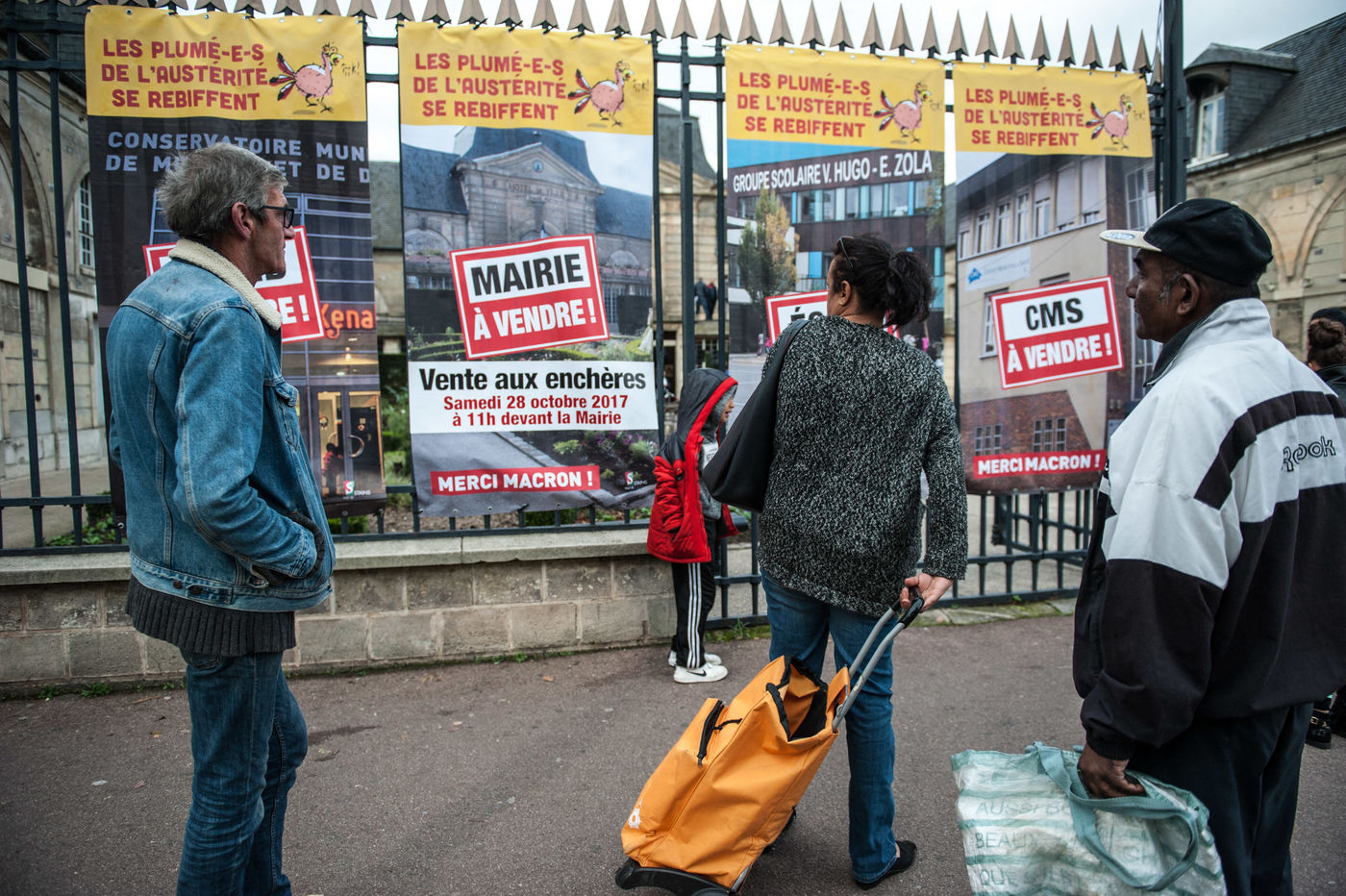 28 octobre 2017 Stains. Azzedine Taïbi le maire de la ville organise avec le studio théatre une fausse vente de aux enchère du patrimoine pour protester contre les politiques d'austerités et les diminution des des dotations aux collectivitées. Le collectifs des "plumés de l'austerité" mobilisé depuis 2014 à l'initiative des maires de seine st.denis se rebiffent de nouveau. Ils sont soutenu ce jours par la présence de députés communistes comme Stéphane Peu , et de la France Insoumise comme Clementine Autain , Eric Coquerel , Sabine Rubin